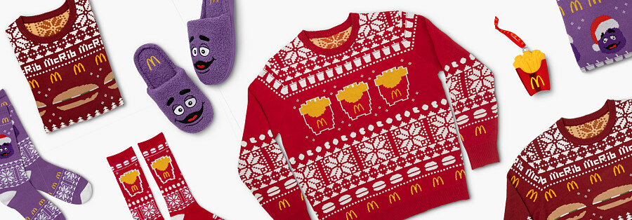 近年麥當勞掀起吉祥物復興運動,小時候熟悉的麥當勞叔叔、奶昔大哥、漢堡神偷與大鳥姐姐也開始搶進時尚界,本次美國麥當勞推出一系列適合聖誕節的Holiday單品,包括醜毛衣、毛毛拖鞋以及聖誕樹吊飾,不管是不是麥當勞迷都會被可愛到!