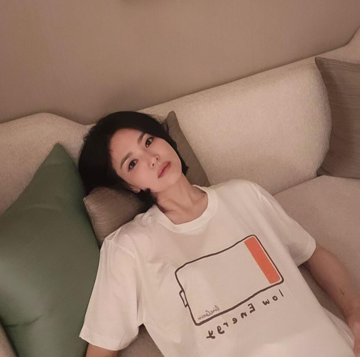 當工作結束、也玩累了,宋慧喬回到住處躺在沙發上的模樣,是否就像是你我的日常?而她的T恤圖案則顯示了她的狀態:沒電了,可愛幽默的設計馬上吸引粉絲的注意,同款被搜出原來是泰國品牌LineCense所推出的T恤,售價還非常親民!