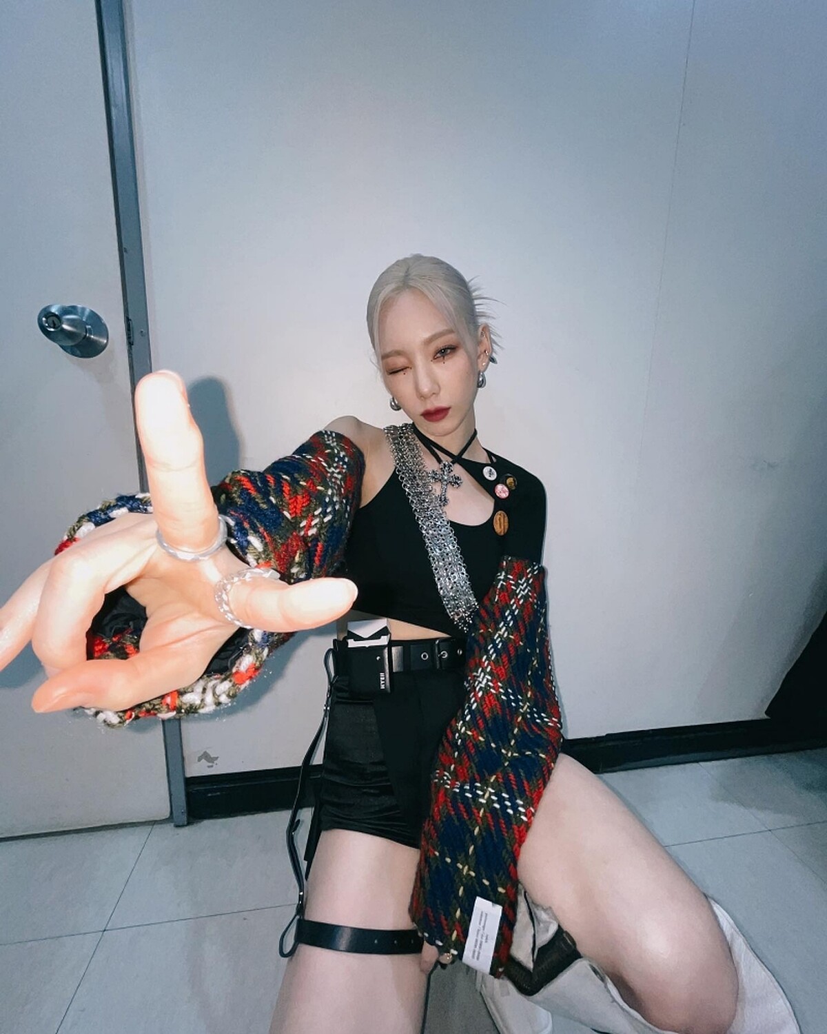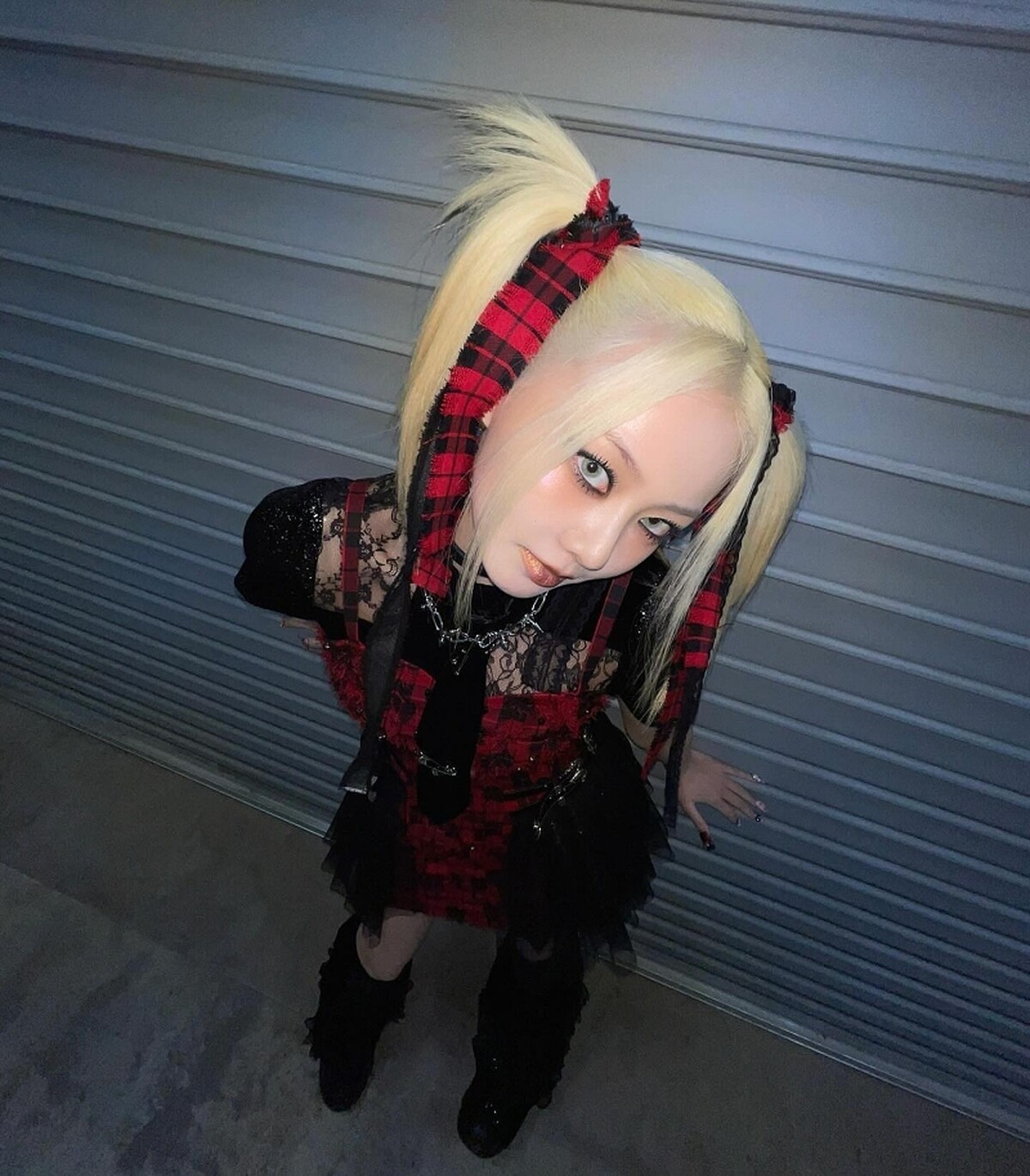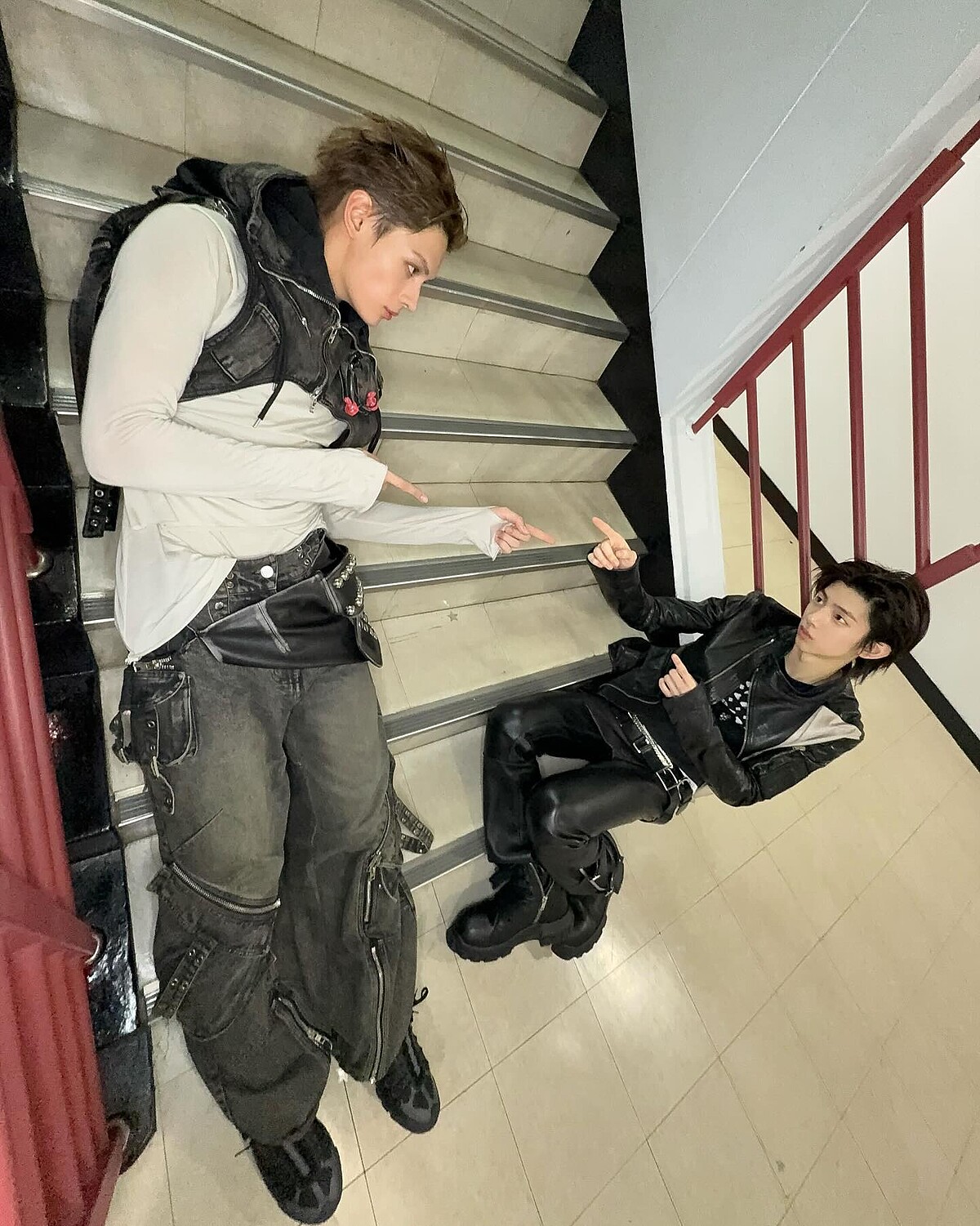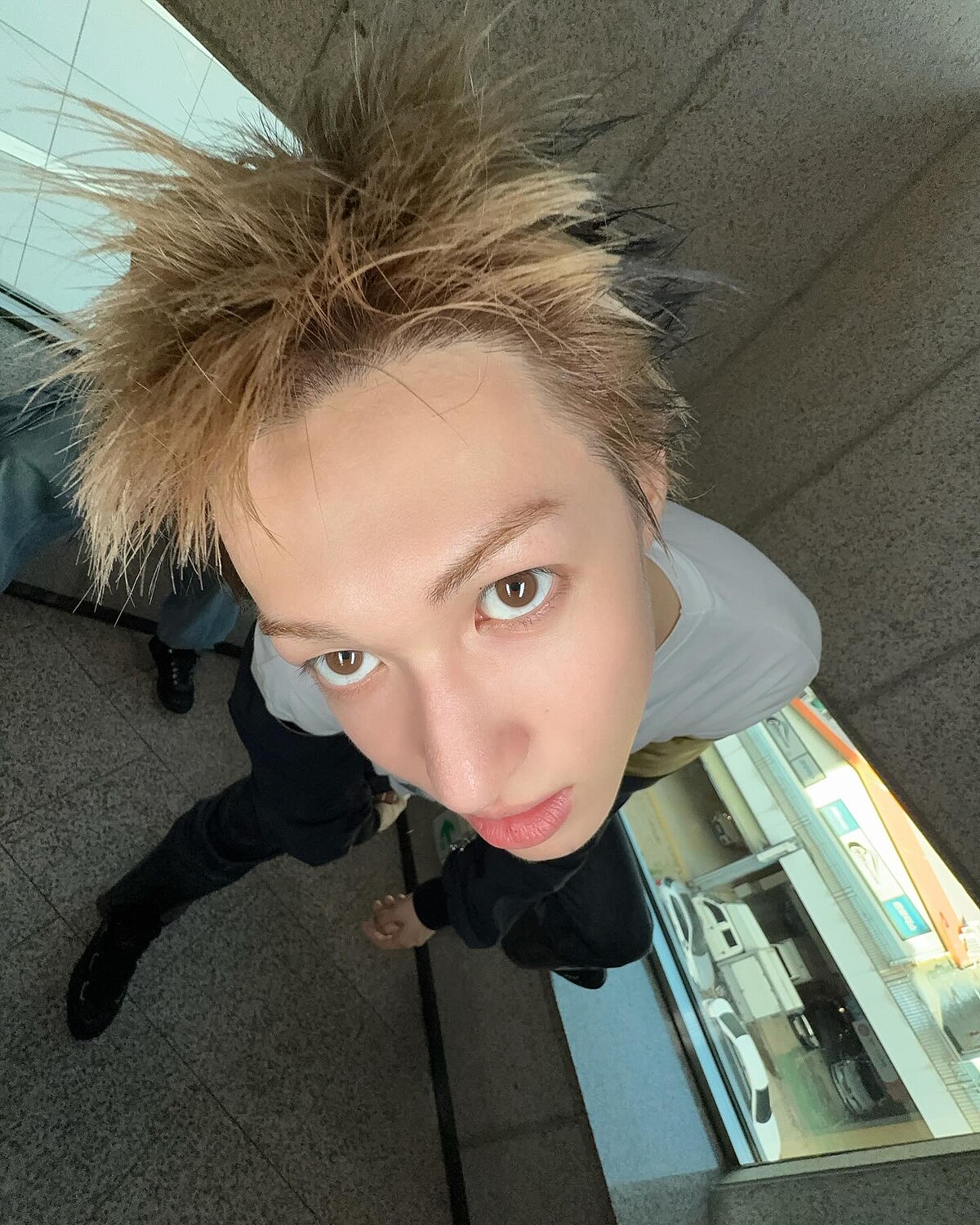 拍攝手法是將手機舉過頭並停在接近 90 度的位置,可以搭配 0.5 倍的廣角,讓照片看起來更有空間感,但四周又不會明顯變形;由上往下拍會形成頭大身體小的奇特比例,也可以讓全身都入鏡,能夠當作穿搭照,既搞怪又有個性,是許多韓星經常使用的 Y2K 拍照技巧。