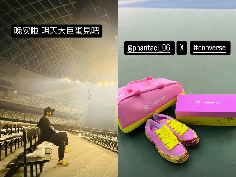 周杰倫在登上大巨蛋前夜,在個人IG上分享了坐在觀眾席的照片,一身黑衣黑帽造型的他,腳上的粉色帆布鞋顯得特別顯眼,原來是來自周杰倫創立的個人潮流品牌PHANTACi與Converse聯名合作鞋款,而這款鞋也即將在本週正式開賣。