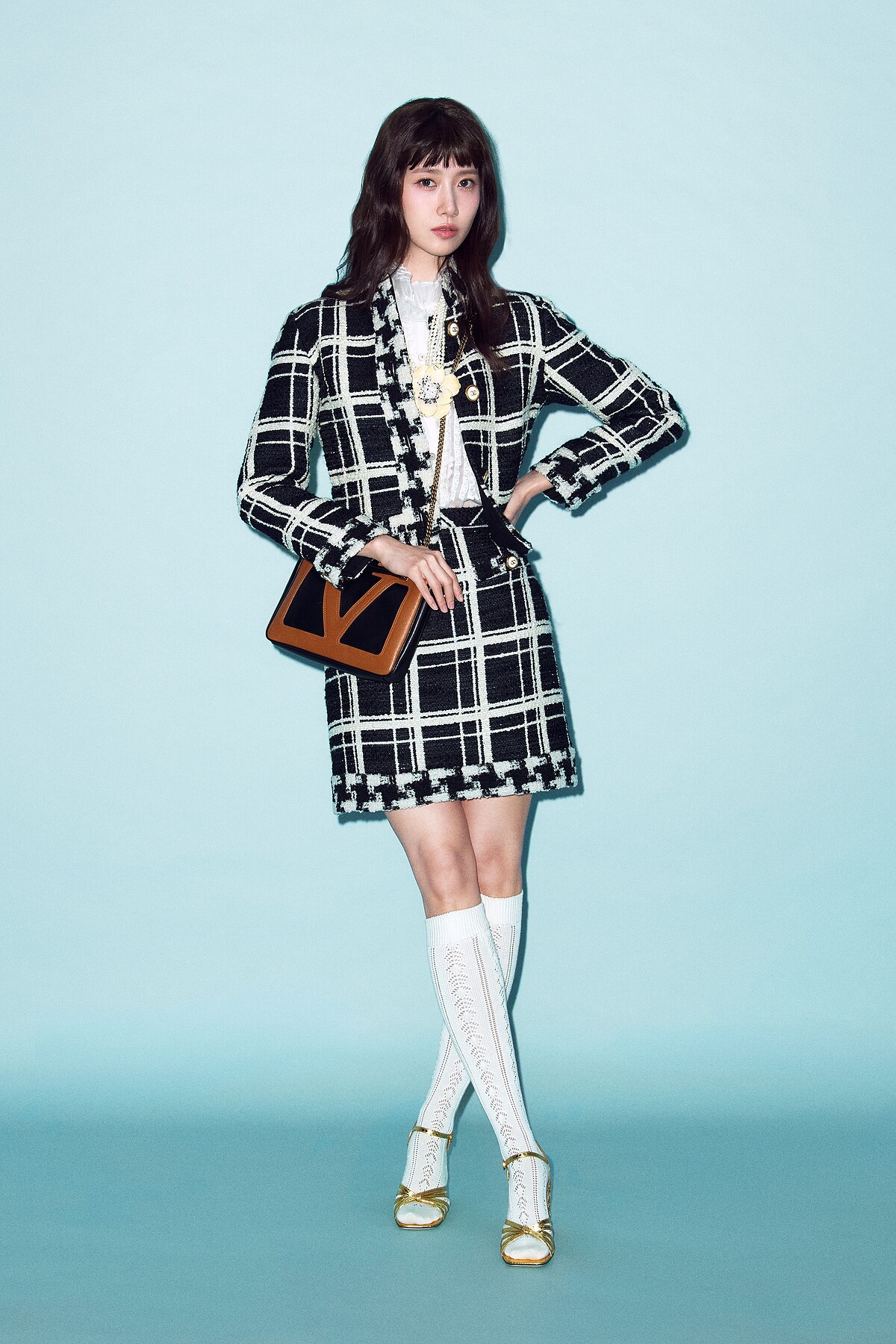 千鳥格搭配白長襪