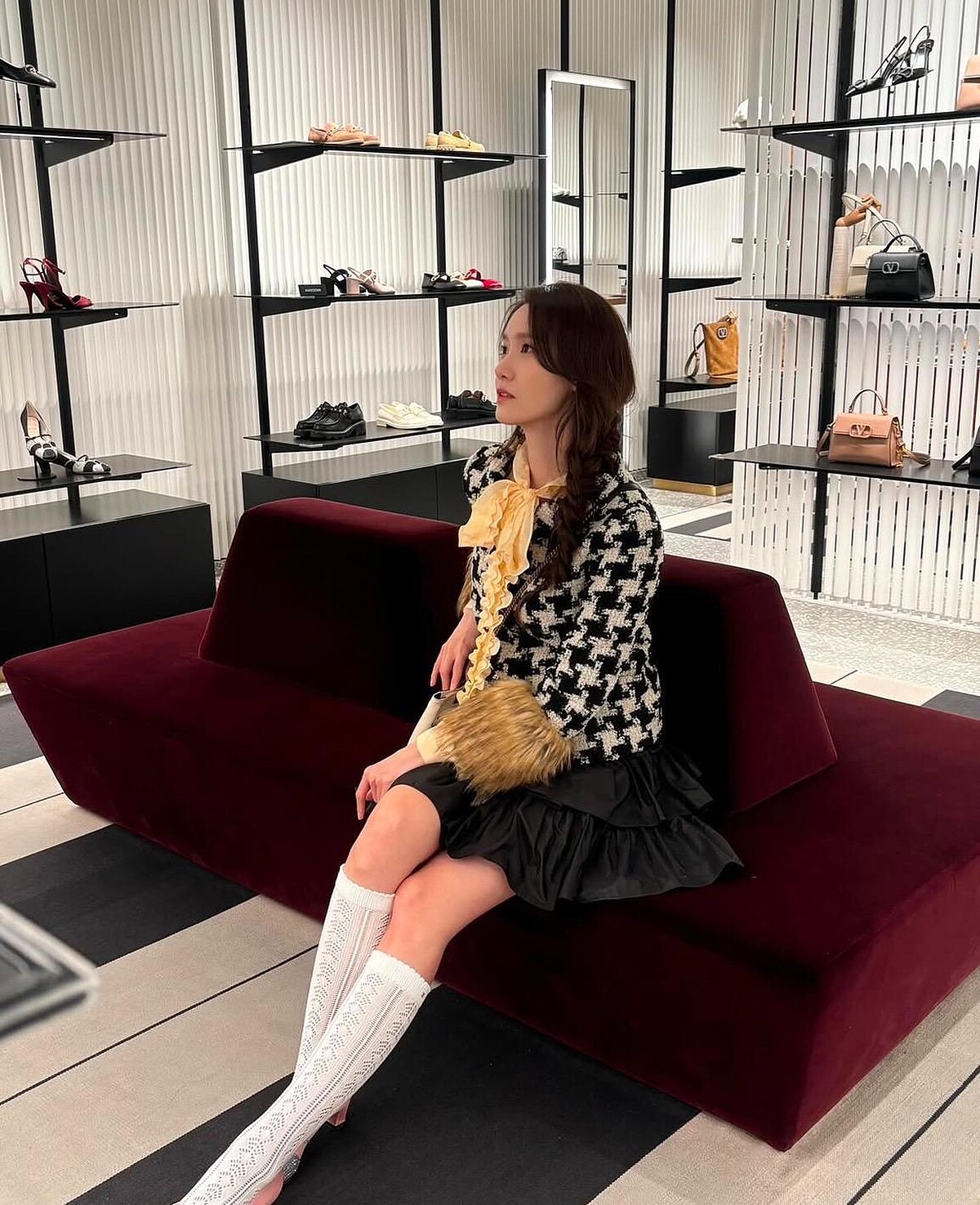 帶有學院風格的格紋外套搭配白長襪,更突顯潤娥的修長美腿,讓他展現絕佳比例,氣質又優雅!