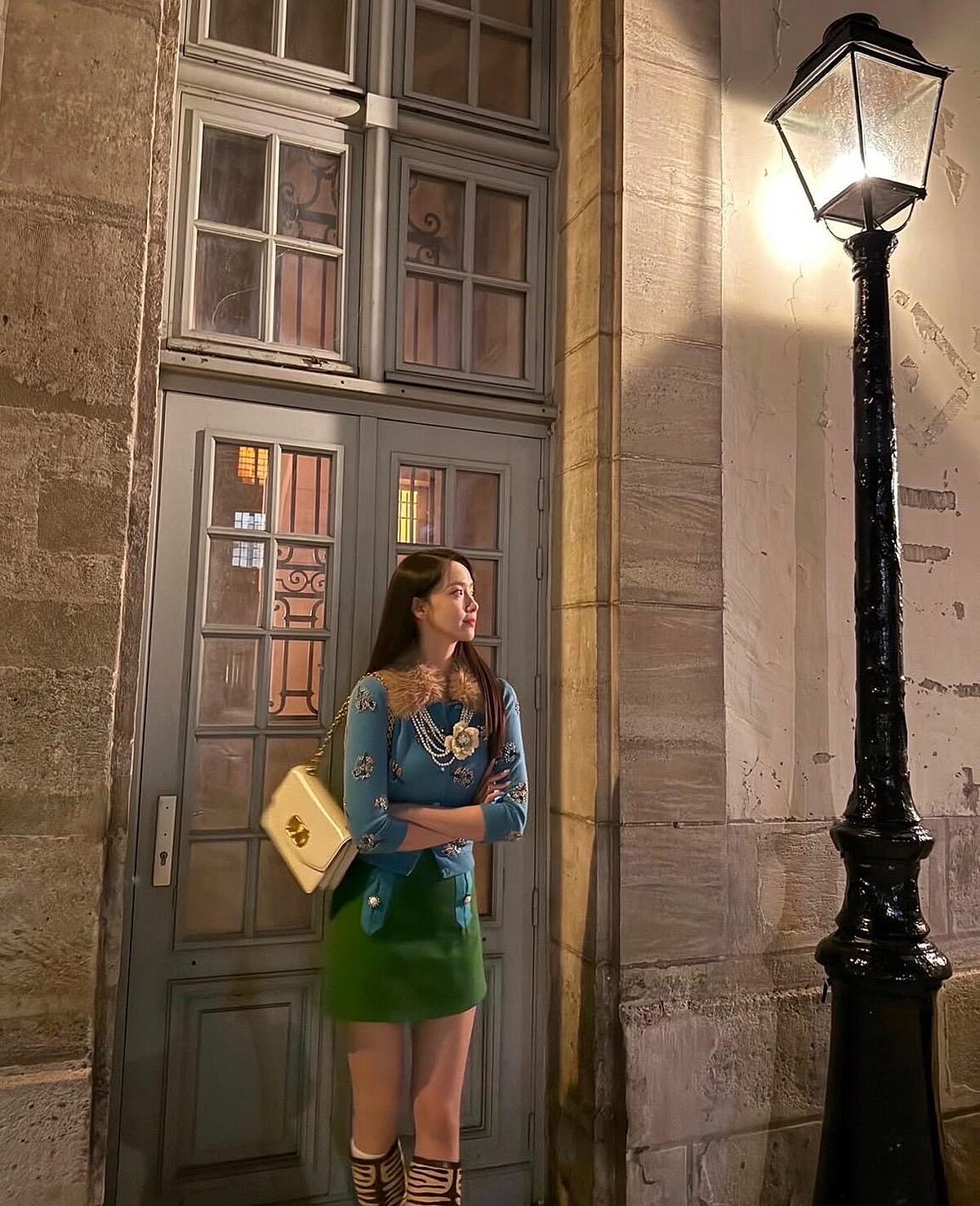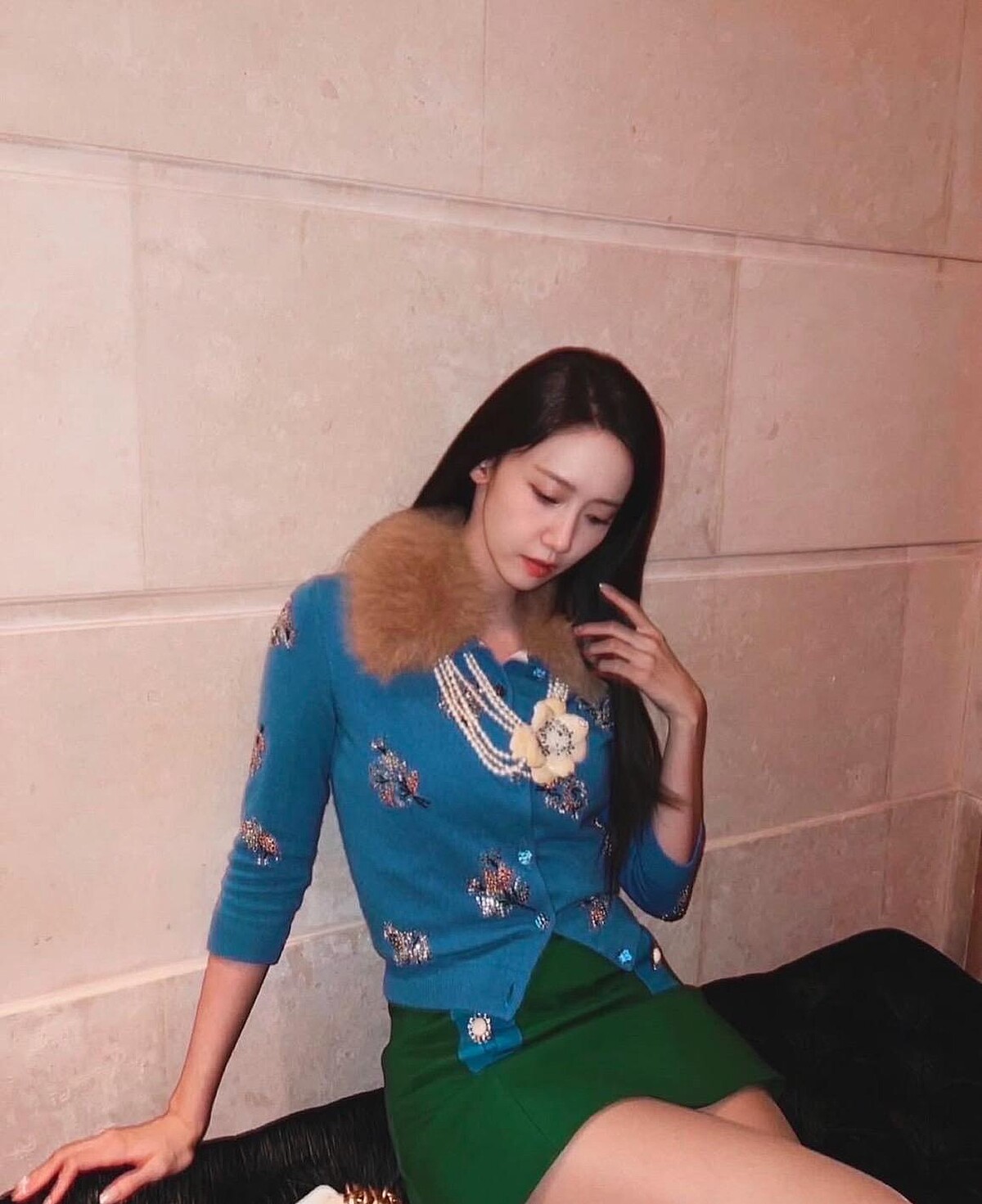 六○年代的交叉印花頭巾再次回歸伸展台,潤娥也以短洋裝搭配蕾絲褲襪搭配同色調的緞面頭巾,如果你已入手頭巾但對造型還沒想法,不妨參考,摩登又現代!