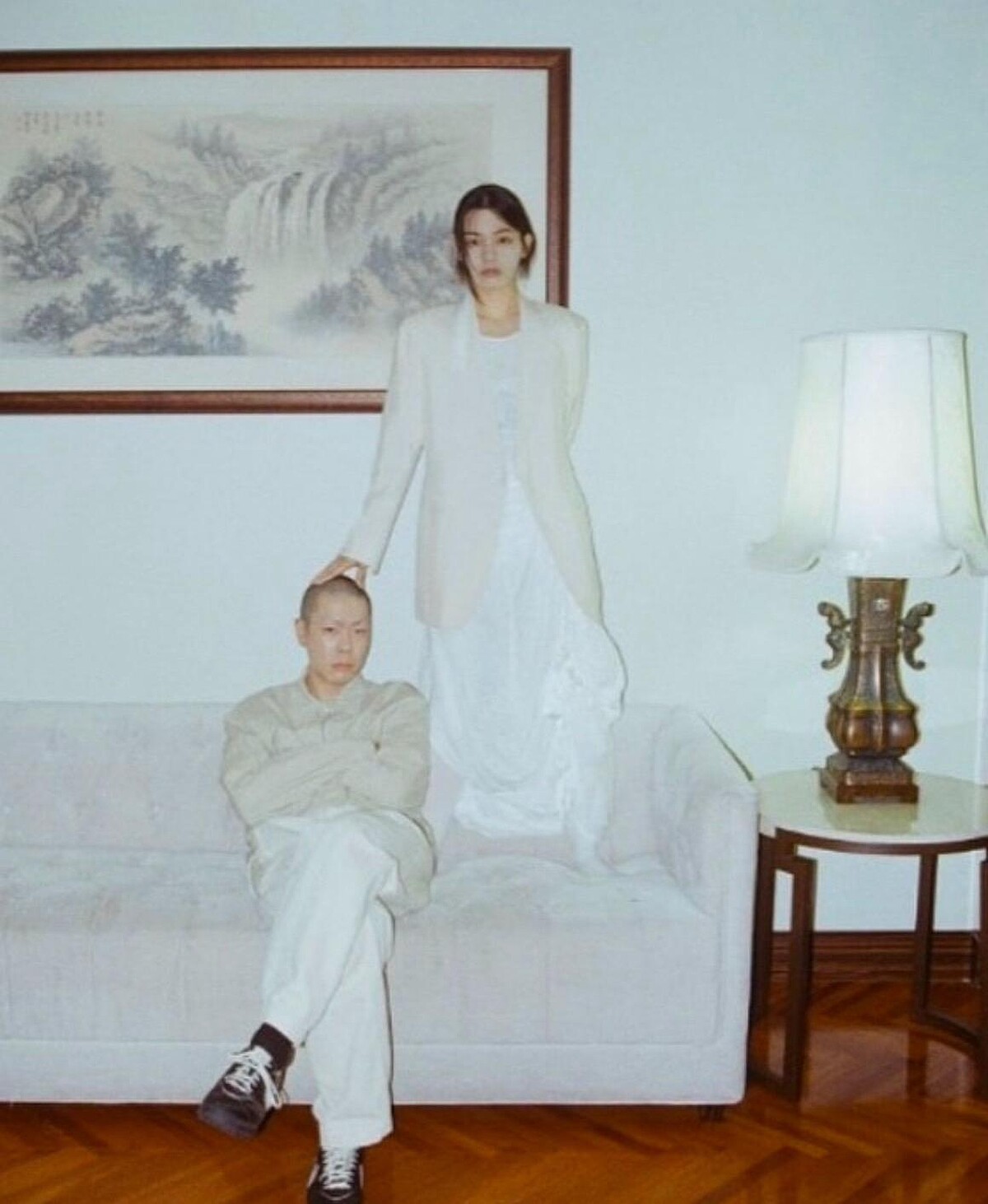 相較一般傳統的婚紗照,吳赫與黃智敏的婚紗照彷彿雜誌大片般,時髦又自然,而這兩個人本身就有著獨特氣質,尤其 HYUKOH 樂團成員本身的造型就已深受時尚圈好評,在這一系列婚紗照也能嗅出吳赫對個人造型的獨特見解。像是下圖兩人的白色調造型,配色與台灣美好年代的客廳背景互相呼應,單品間平衡的比例配置,打破一般婚紗都要穿西裝、禮服的刻板印象,將單品混搭,使兩人的整體造型更時髦,畫面也更充滿力道!