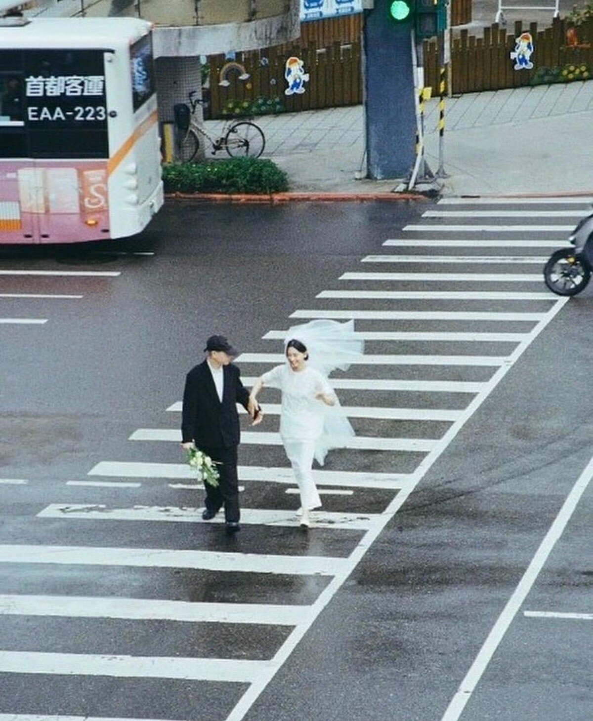 將畫面轉到此場景,是否覺得似曾相似?沒錯,這就是台北人熟悉的和平東路與新生南路路口,畫面中的天橋即在大安森林公園旁邊,但是,這座天橋已在今年十一月拆除,實在有點可惜。吳赫配戴棒球帽與 Oversize 西裝外套,黃智敏則穿著一身浪漫白紗混搭褲裝,帶些日本雜誌感卻又有著獨特的高級街頭氣息!
