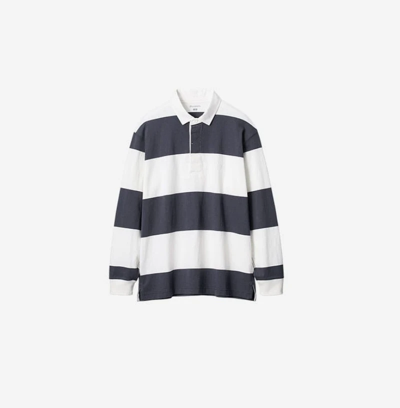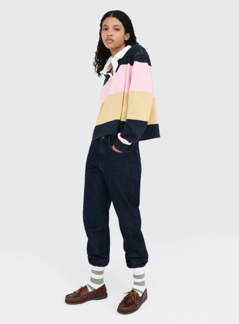 將拼色長袖寬橫條設計的橄欖球衫搭配上簡約俐落的直筒牛仔褲,在寬鬆與舒適度上展現,清新的學院運動風格,襪子與橫條紋上衣呼應,搭配上樂福鞋則是增加造型趣味性。