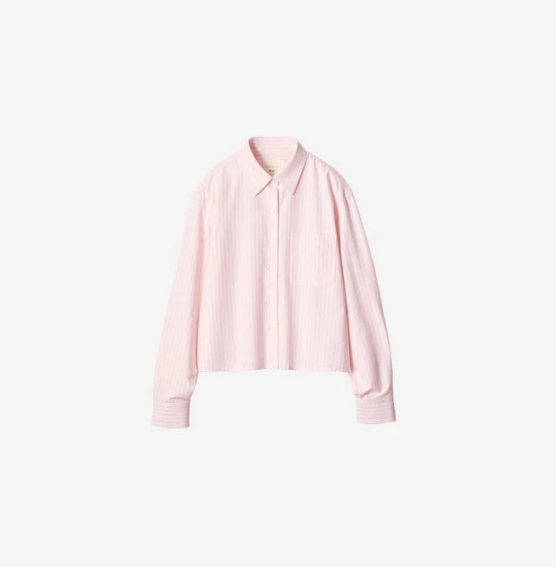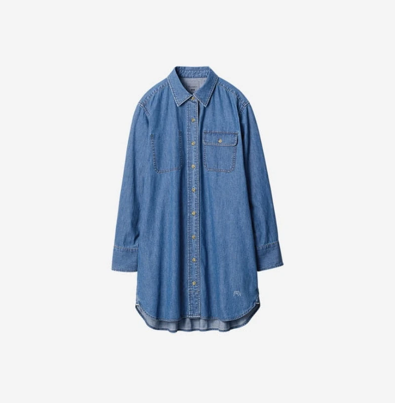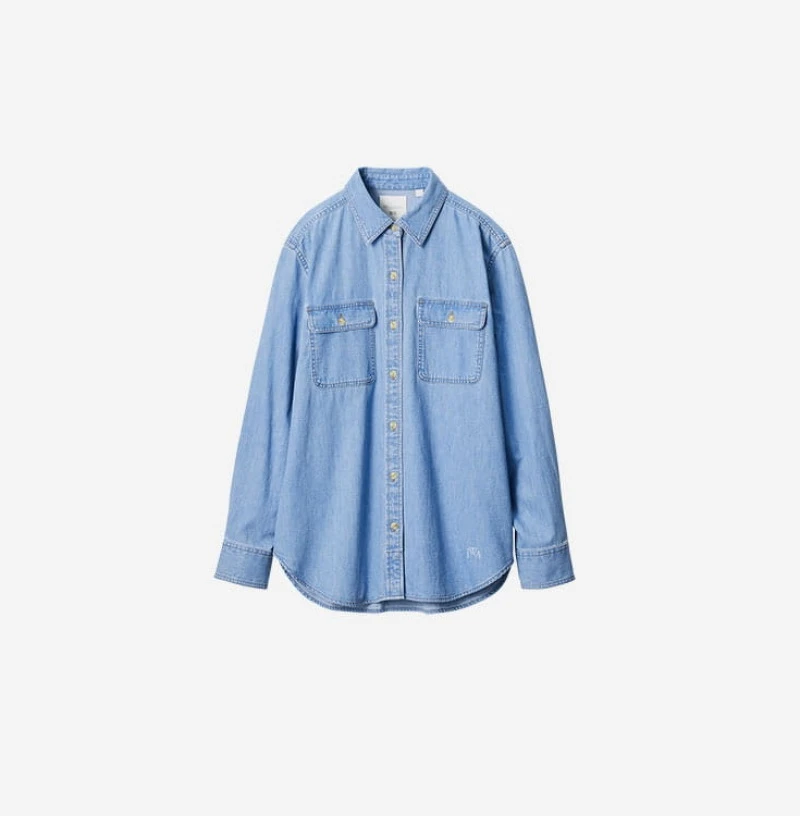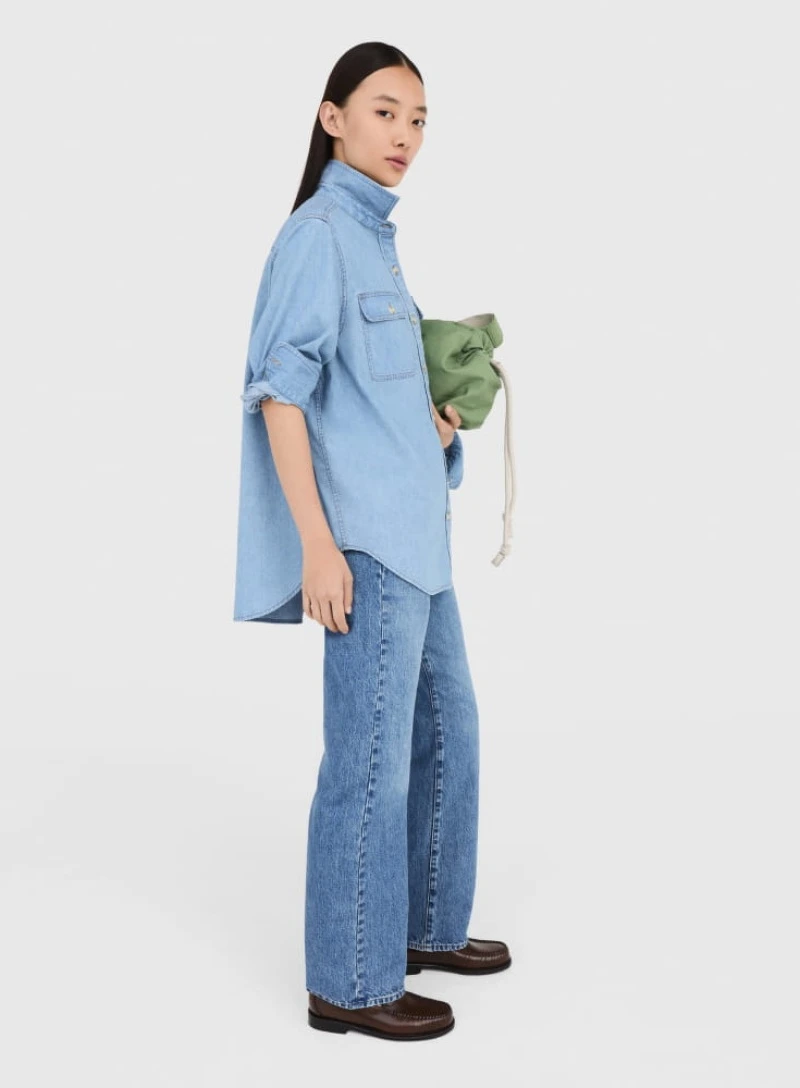 丹寧襯衫與淺刷色的直筒牛仔褲營造出休閒的時髦氛圍,透過單一淺藍色系強調清爽簡約,搭配上酪梨綠色包袋點綴,增添柔和層次感。