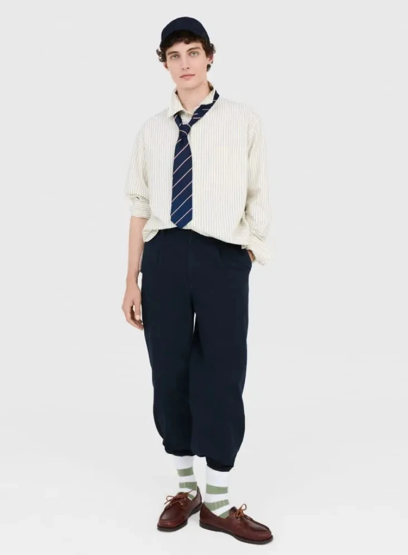 條紋襯衫搭配寬鬆長褲,再透過領帶與反戴棒球帽的搭配增添學院氣息,整體來看,春夏的合作系列融合JW Anderson的細節巧思與Uniqlo的功能性,既適合日常穿搭,又不乏時尚感。