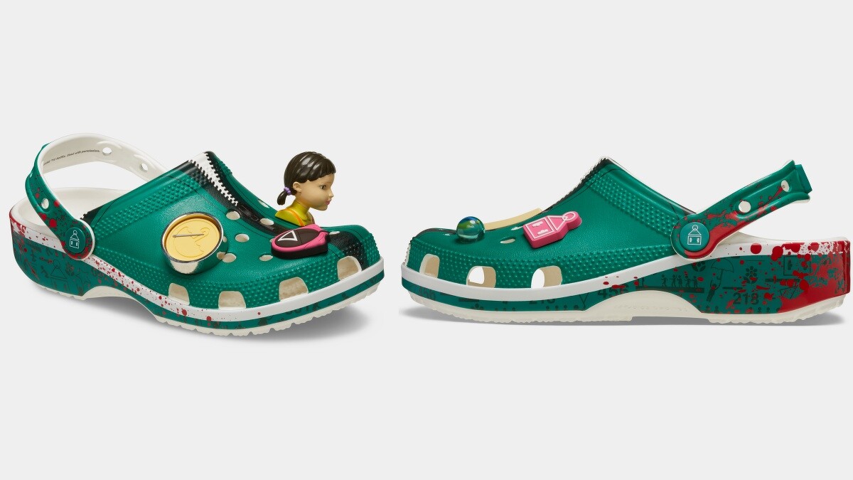 Crocs在近日也推出《魷魚遊戲》聯名鞋款,鞋型選擇以經典克駱格為基礎,並以遊戲中參賽玩家的白綠運動制服為主要色系,鞋內有「SQUID GAME」的英文標誌,鞋底外側更又遊戲中染血的刺激細節,鞋款上的立體英熙娃娃、工作人員面罩裝飾都完美重現劇中細節。