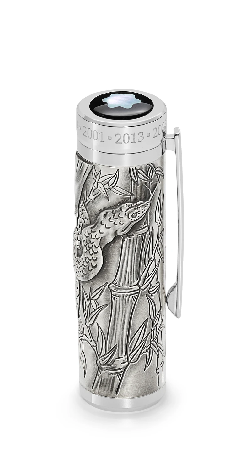 蛇年限量款鋼筆細節超美!首先看筆身:鍍鉑金筆身以鐫刻方式飾上中國結抽象圖案,也讓人想起蛇麟;筆尾鑲嵌蛋白石,象徵蛇的誕生;手工製作的Au 750純金鍍銠筆尖也刻飾有蛇圖案;部分經燻黑和拋光處理的筆蓋以Ag925純銀製作,飾有向上盤纏於竹樹上的蛇,象徵長壽與幸福,筆蓋圓環鐫刻2025年份,頂部飾有珍珠母貝的品牌標誌。至於取名512也有美意:來自幸運數字8X8X8的總和,取其象徵吉祥訊息。