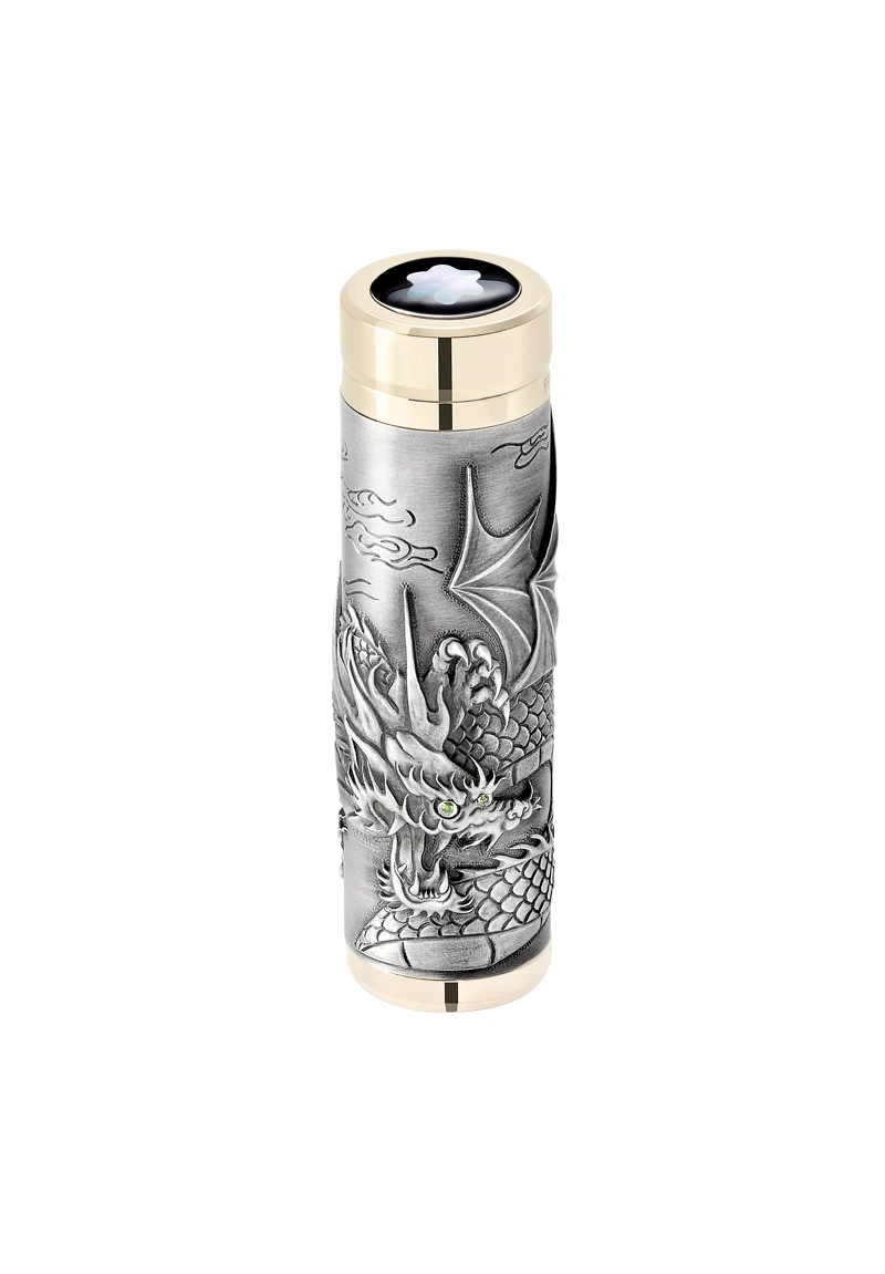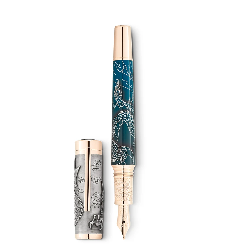 應龍又名翼龍,在東方古代神話中,是為幫助降雨治水的祥獸,也常與春天、藍綠青色做為聯想。應龍的雄性霸氣呈現於新款限量款88鋼筆之上:龍首以浮雕形式詮釋於Ag 925純銀筆蓋,龍身則延續至筆身,並以深綠漸變至祖母綠上色同時塗覆亮漆,部分龍身更飾有鑽石,筆尾鑲嵌綠碧璽,細節更顯不凡;Au 750金質製作的筆尖飾有「虹」字符號──源自三千多年前商代甲骨文,巧妙描繪雙頭龍,有著雨過天晴的寓意;筆蓋飾有黑色縞瑪瑙及珍珠母貝品牌標誌,外層以藍寶石玻璃覆蓋。