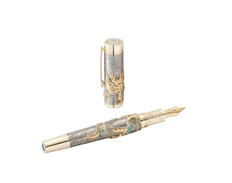 點綴寶石的鋼筆太值得收!由上而下的細節亮點有:筆蓋頂端鑲有一顆品牌標誌形狀鑽石,周圍鑲飾一圈明亮式切割鑽石;飾有一顆淺藍色藍寶石的筆尖,同時以「虹」字符號;Au 750白金筆身由金質鐫刻打造之祥龍為視覺焦點,綴上綠色沙弗萊石、藍色帕拉依巴碧璽、藍色托帕石和鑽石;最後由鑲嵌淺藍色藍寶石的筆尾,寫下完美風采。