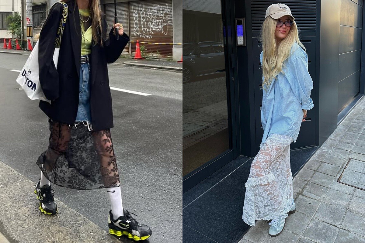 在Ballet Core的加持之下,浪漫甜美的蕾絲裙在今年夏季也非常受到注目,除了單穿搭配打造透式的輕盈感穿搭之外,綁在腰間與其他下身單品疊搭的方式也很常見。