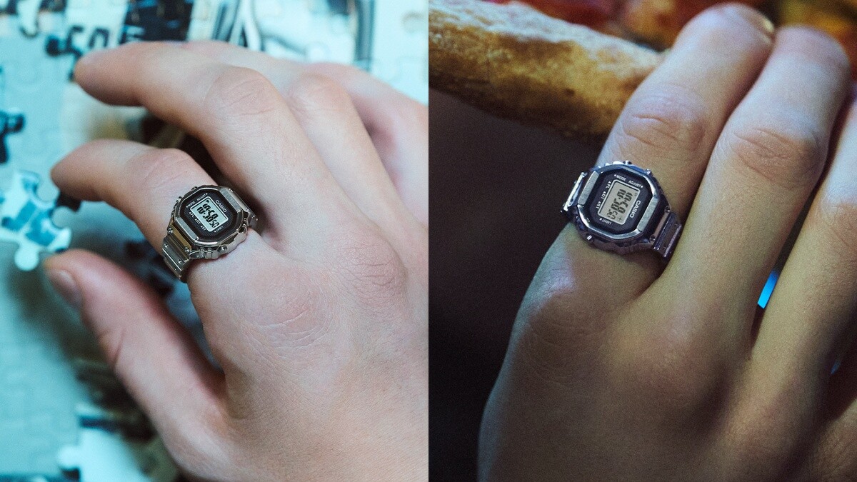 手錶戒指的的設計靈感與CASIO品牌源起息息相關,前身是樫尾製作所的CASIO計算機株式會社,在當時開發了一款可以戴在手指上的指環煙斗,在當年一問世便大獲成功,也是本次戒指手錶的設計原型。這款戒指手錶相較起標準手錶模型縮小約10倍,除了有完整的時間功能之外,標準的三按鈕功能也一應俱全,錶殼、錶背與錶圈也是透過新工藝一體成型製作。