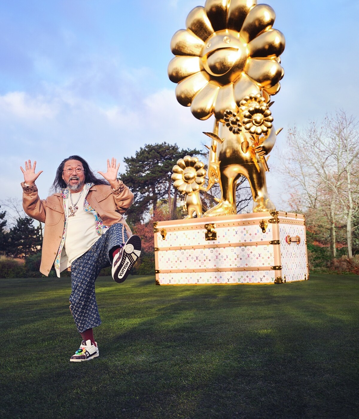 2002年時,村上隆與Louis Vuitton當時的創意總監Marc Jacobs開展了雙方的首次合作,也是路易威登經典Monogram首次在聯名中被重塑,在村上隆標誌性的的繽紛配色下呈現全新的大膽面貌,推出當時造就一系列現象級搶購熱潮,更是時尚界令人印象深刻的精彩合作之一,在這之後村上隆與路易威登持續在藝術上展開不少合作企劃,而本次聯名的盛大回歸,早在2024年9月時,村上隆的巨型金色小花雕塑與LV Monogram行李箱一起在京都市京瓷美術館的日本花園中合體亮相,就隱約透露端倪!