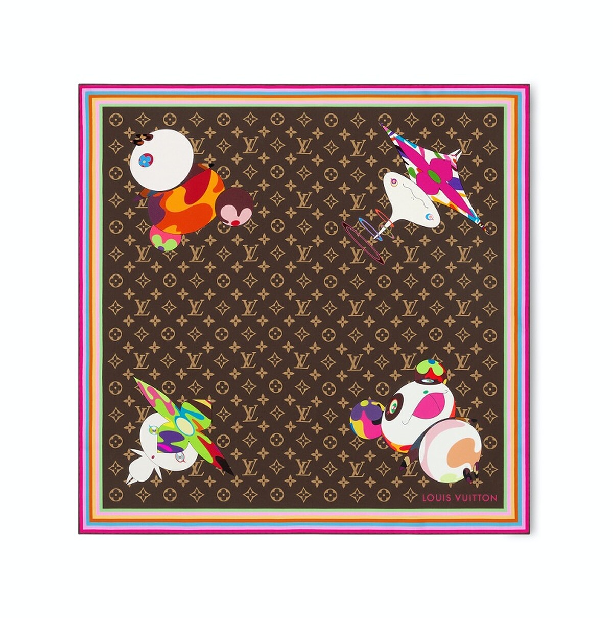 本次除了多色彩的Monogram之外,俏皮的LV Hands LOGO也在Alma BB手袋與絲質方巾上呈現,而運動鞋、鑰匙圈與滑板、Attrapes-Rêves香水之上可以看到Superflat Panda與Superflat Garden的圖案與笑臉花朵設計。