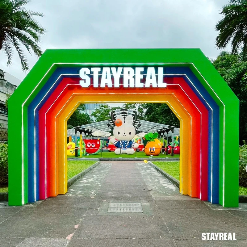STAYREAL PARK 純真公園台北站在松山文創園區展開,分為有巨型兔兔Rabbit.Q與可愛的MOJO FAMILY夥伴進駐的巴洛克花園以及「貨櫃市集」椰林大道兩個展區。在公園活動之外,更打造了品牌主題雙層觀光巴士,開啟「城市探索」之旅,是粉絲們必朝聖的活動。
