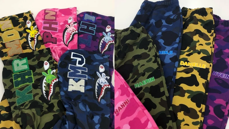 本次在泰國機場NewJeans五人身穿不同顏色的BAPE迷彩套裝,則是出自服裝訂製設計師Neo(neookada)之手,在成員專屬配色的運動套裝帽夾的鯊魚嘴上有著上有著團體標誌輕的兔子圖案以及姓名縮寫布章,下身褲款則是在側邊繡上成員的名字。