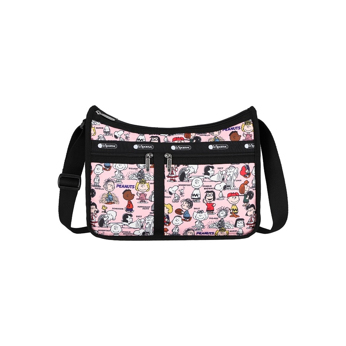 粉色系為主的經典斜背包上,有著滿版的漫畫風格史努比角色圖樣,大小實用又耐裝。