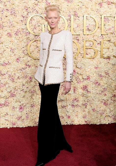 時尚仙人Tilda以Chanel的金色鑲邊軟呢上衣與修身裙裝,展現獨特的仙氣。