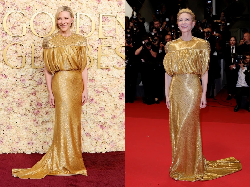 「精靈女王」凱特布蘭琪本屆金球獎再度舊衣新穿!身上的金色Louis Vuitton禮服在2024年的坎城影展期間首映會就曾經上身過。其實,這並不是凱特布蘭琪第一次重穿過去的紅毯造型,在2023香水基金會大獎(Fragrance Foundation Awards)時,他也成重穿了當年金球獎(Golden Globes)頒獎典禮上穿過的Giorgio Armani Privé黑色禮服,2018年坎城影展、2020威尼斯影展也是以穿過的禮服亮相,可以說是好萊塢永續愛地球的表率。