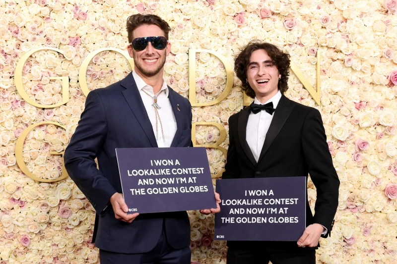 在一種大咖明星之間,有兩位名人舉牌登場,其中一位原來就是在2024年萬聖節期間全網瘋傳的「甜茶模仿大賽」冠軍Miles Mitchell,而和他一起登上紅毯的則是在「格倫鮑威爾模仿大賽」中拿下冠軍的Max Braunstein,兩人分別拿著「我拿下在名人相似大賽冠軍,我現在在金球獎」的標語在紅毯上合體,成為本屆金球獎紅毯上幽默的一筆!