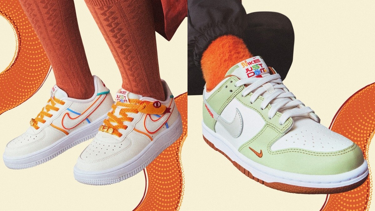 除了奶茶色之外,另一款AF1鞋款,則是大膽繽紛,直接將手繪版的蛇頭造型與鞋帶結合,讓蛇年元素幽默的在鞋款中展現,另外還有青蘋果綠搭配橘色Swoosh的Dunk鞋款,在鞋舌上使用蛇形文字元素,看來活潑靈動。