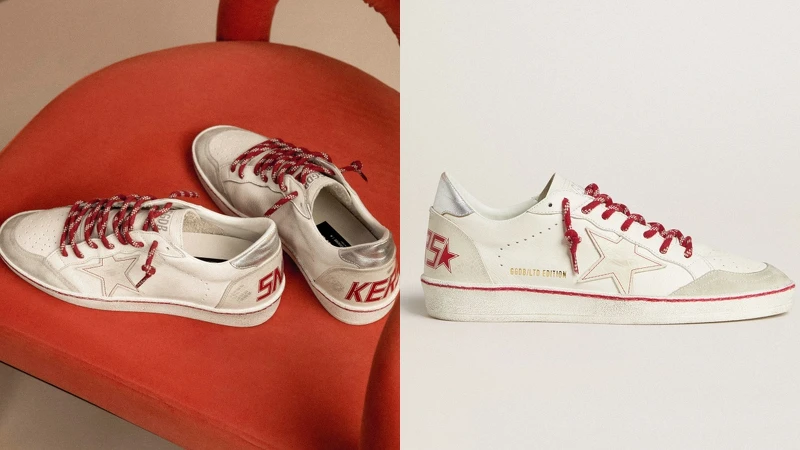 Golden Goose推出限定的Ball Star鞋款,鞋身是白色皮革搭配蛇紋印花,並佐以紅色縫線及紅白相襯鞋帶,鞋後跟處還有車縫設計的英文字樣,在日常穿搭中加入紅色的喜慶氛圍。