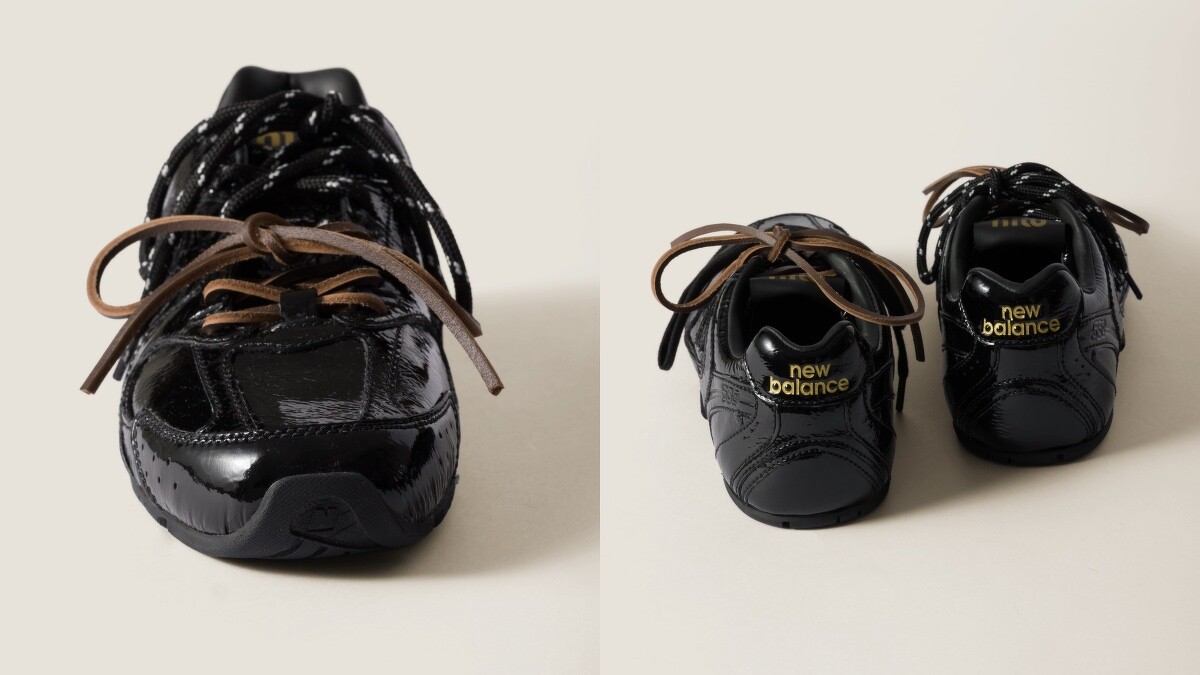全新色系的530鞋款,鞋身以全黑色光面漆皮打造,搭配上黑色與棕色皮革鞋帶,在暗色系中也能透過材質與色系展現高級的層次感,整體也特別帥氣,在鞋舌與鞋後跟處都搭配金色的Miu Miu與New Balance品牌標誌,官方售價台幣39,000元,發售時間未定,推薦給想嘗試酷帥Miu系穿搭的你。