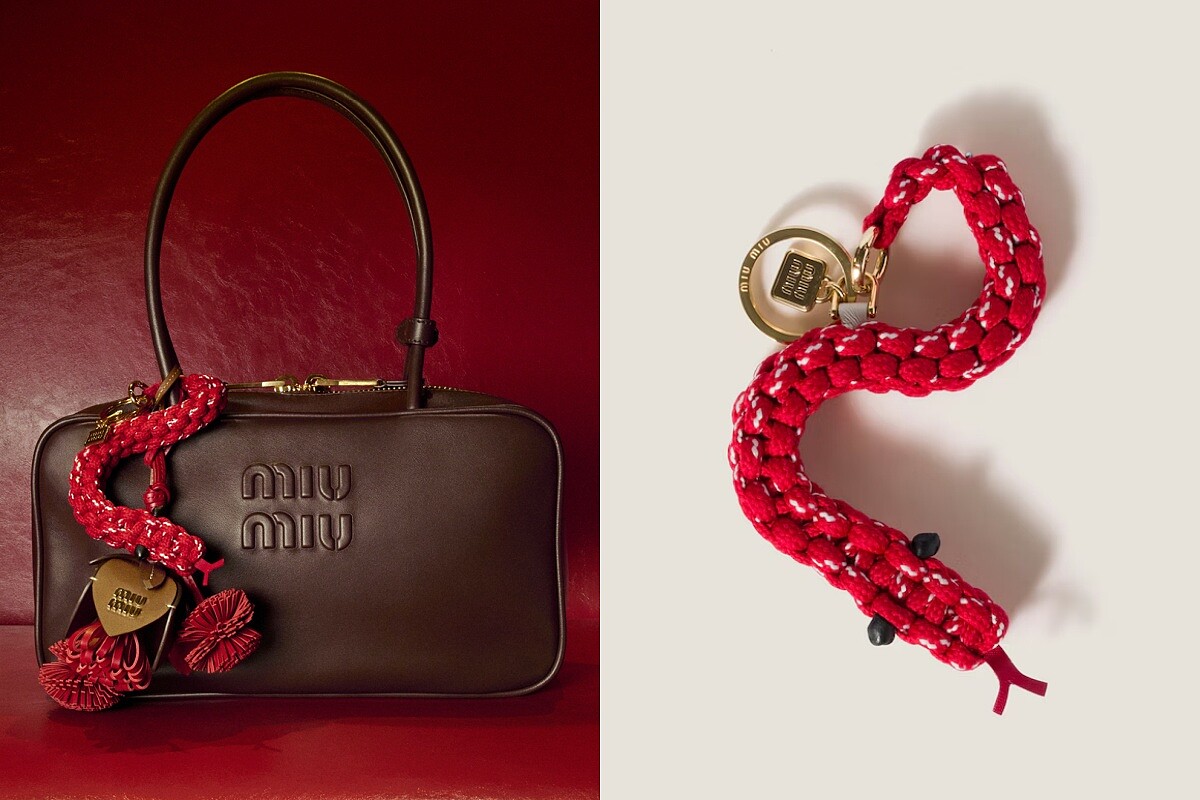 Miu Miu則是將蛇年設計與繩結藝術結合,以編繩的方式打造了一蛇形掛飾,繩結的設計降低了蛇本身的寫實感,短短的蛇信加入也讓整體看起來特別可愛,非常適合掛在包包上作為新年開運的小亮點。