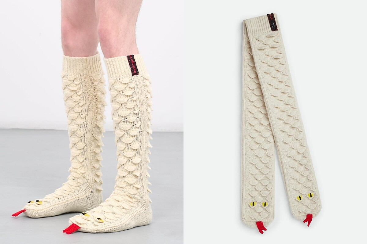 雖然不是特別為了蛇年的設計,但Bottega Veneta曾在2023秋冬推出過一雙針織蛇設計半統襪,長長的襪身搭配立體針織的蛇紋設計,腳背處則有黃色的蛇眼與紅色蛇信,是細節精緻又非常幽默的一款單品。