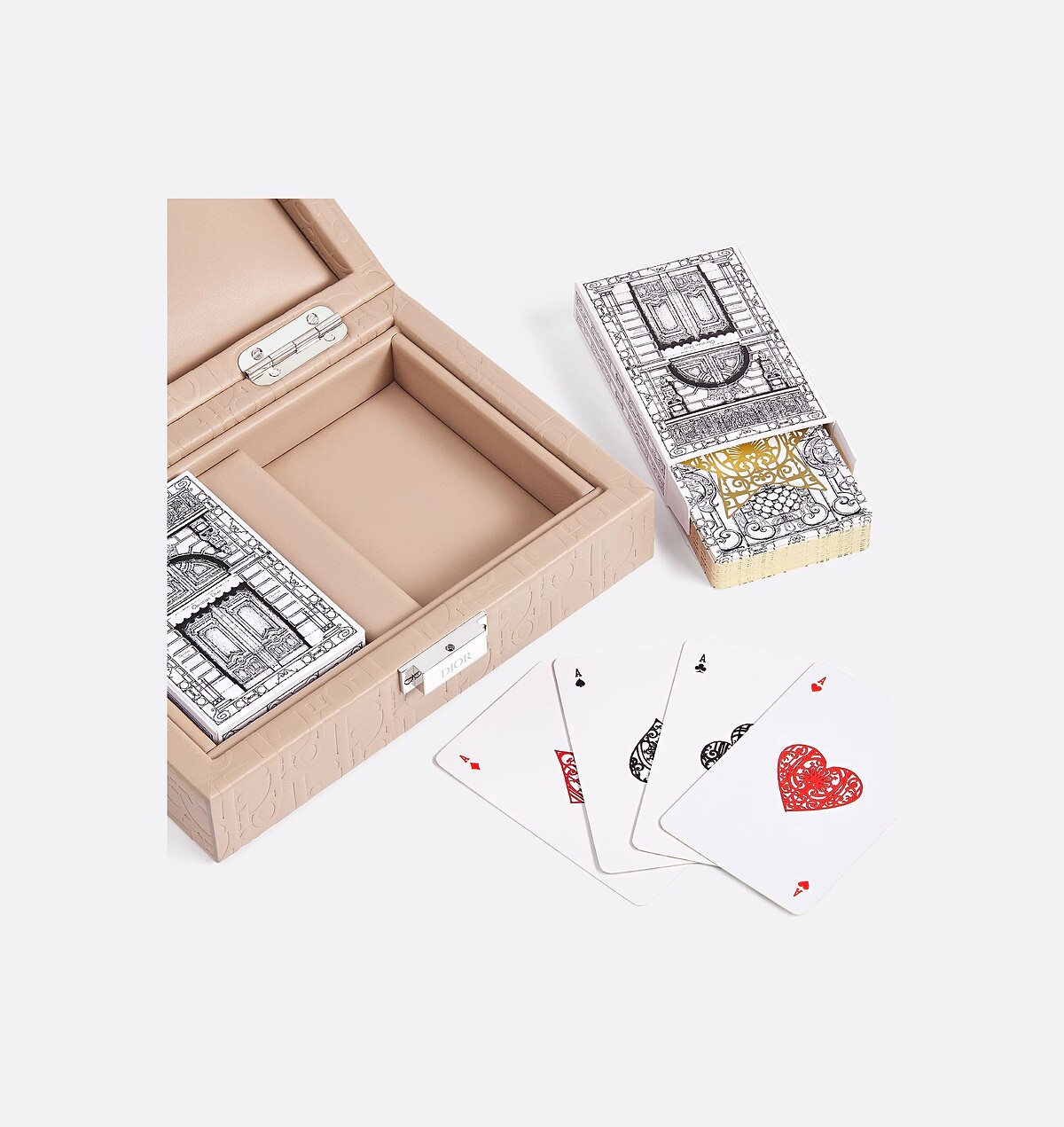 迪奧先生在他的回憶錄中曾表示對撲克牌十分著迷,這款藏身在Maison系列中的撲克牌組,以30 Montaigne精品店為主題,並搭配上Dior Oblique壓印皮革收藏盒。