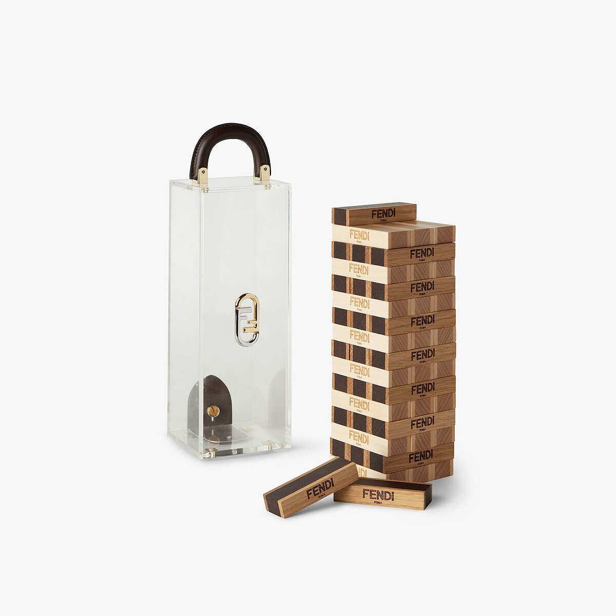 藏在Fendi生活家居系列中的疊疊樂,除了木製長型方塊上有品牌燙印之外,搭配的收納盒更是富有皮革提把、金屬Fendi O'Lock標誌點綴,就算不玩也很適合做為居家裝飾。