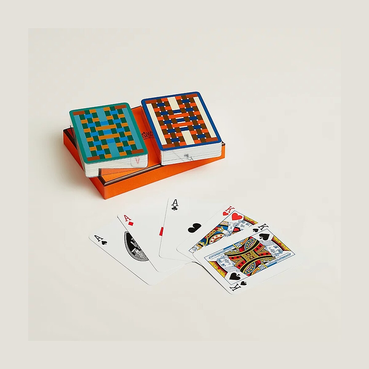 以Fanette Mellier設計的H tissage字體為主題的愛馬仕撲克牌組,透過水平和垂直的對比色"H"字母元素在卡牌背面展現品牌的藝術性,卡牌側邊更鑲有銀邊增添高雅氛圍。