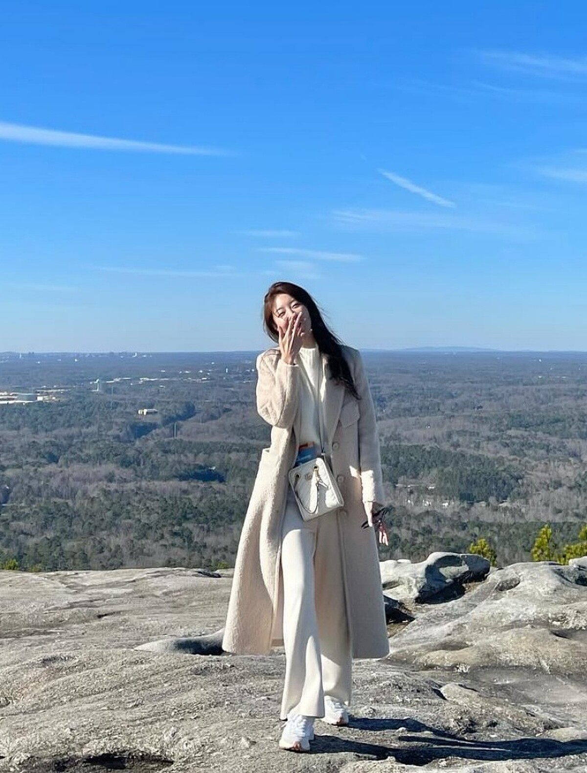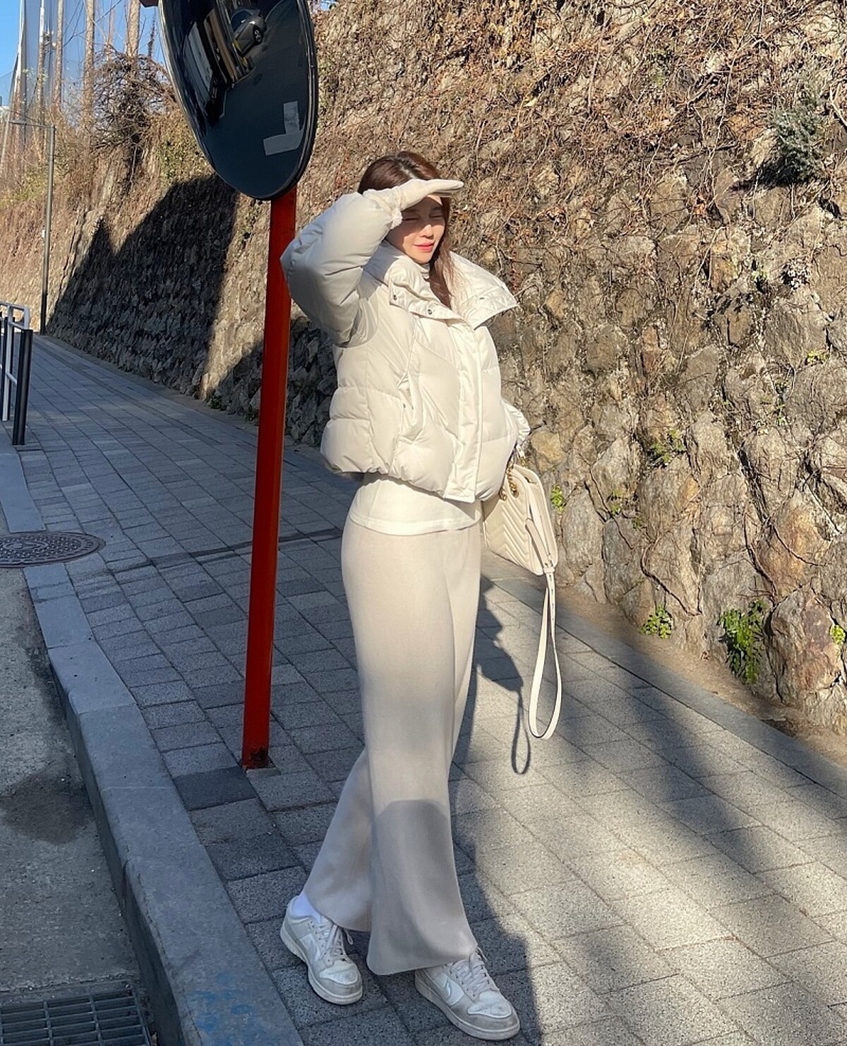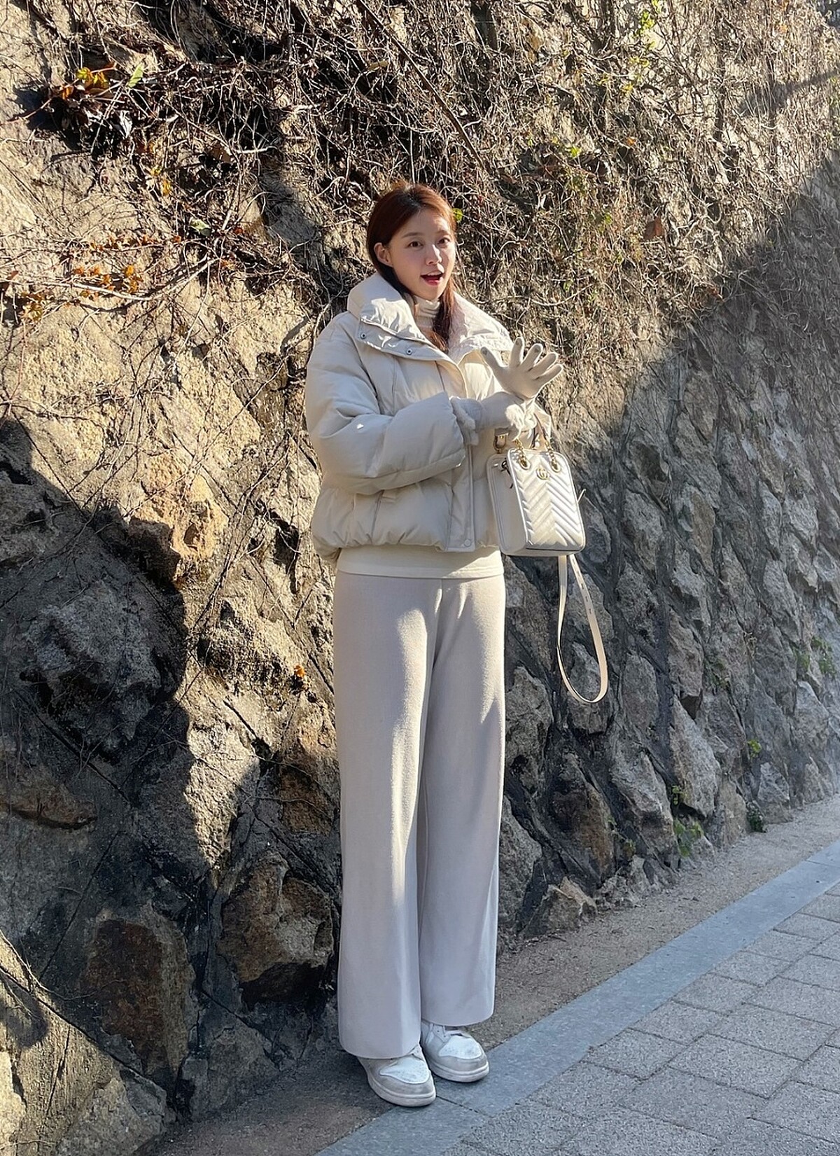 喜愛淺色系的鄭裕陳在冬季穿上奶油系風格,從羽絨外套到寬鬆長褲、鞋子及手袋都維持統一的色系,營造出和諧的視覺效果,這樣的One-Tone穿搭在親切的單品詮釋之下兼具優雅的質感,寬鬆的短款羽絨外套視覺上也讓整體比例更顯修長,是裕陳的穿搭中常見的色系選擇之一。