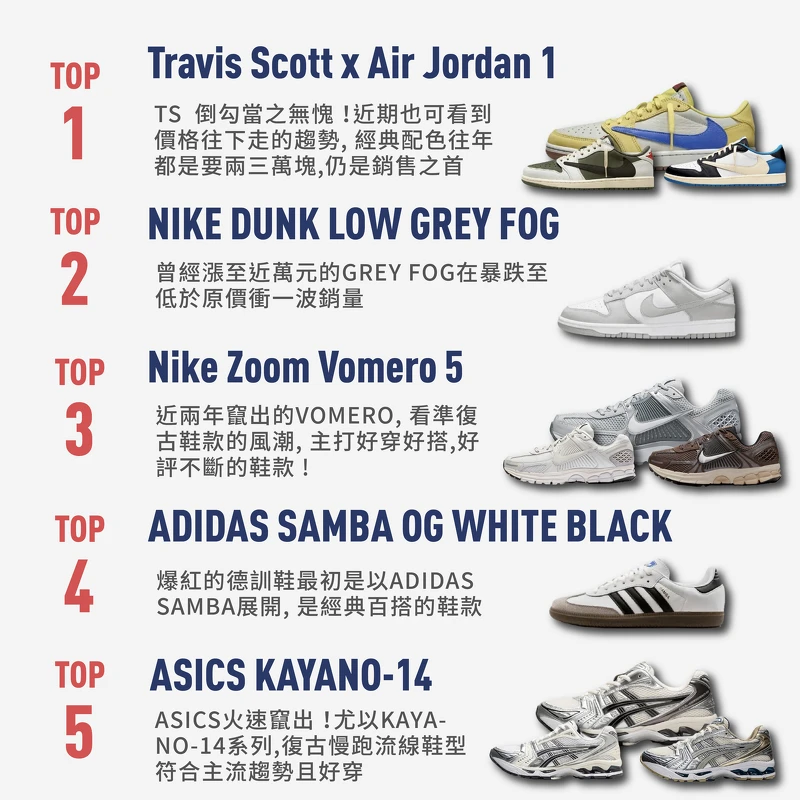 Top 1:最後,榮登榜首的,無疑是倒鉤 Travis Scott x Air Jordan 1 Low OG Medium Olive,原本要數萬元才能入手,近期發售的 AIR JORDAN 1 LOW OG TRAVIS SCOTT CANARY 據悉只要一萬出頭的價錢就有機會入手,讓倒鉤鞋款依然是鞋頭們的爆款首選!