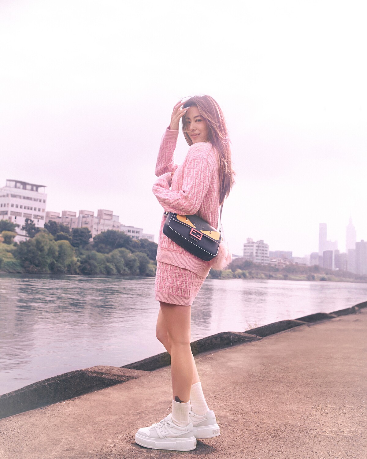 首先看到宋雨琦身著 FENDI 重新演繹品牌 DNA 元素,推出搶眼的 FENDI Eyes 限定系列短 Tee,下身搭配粉色短裙,展現長腿好比例!