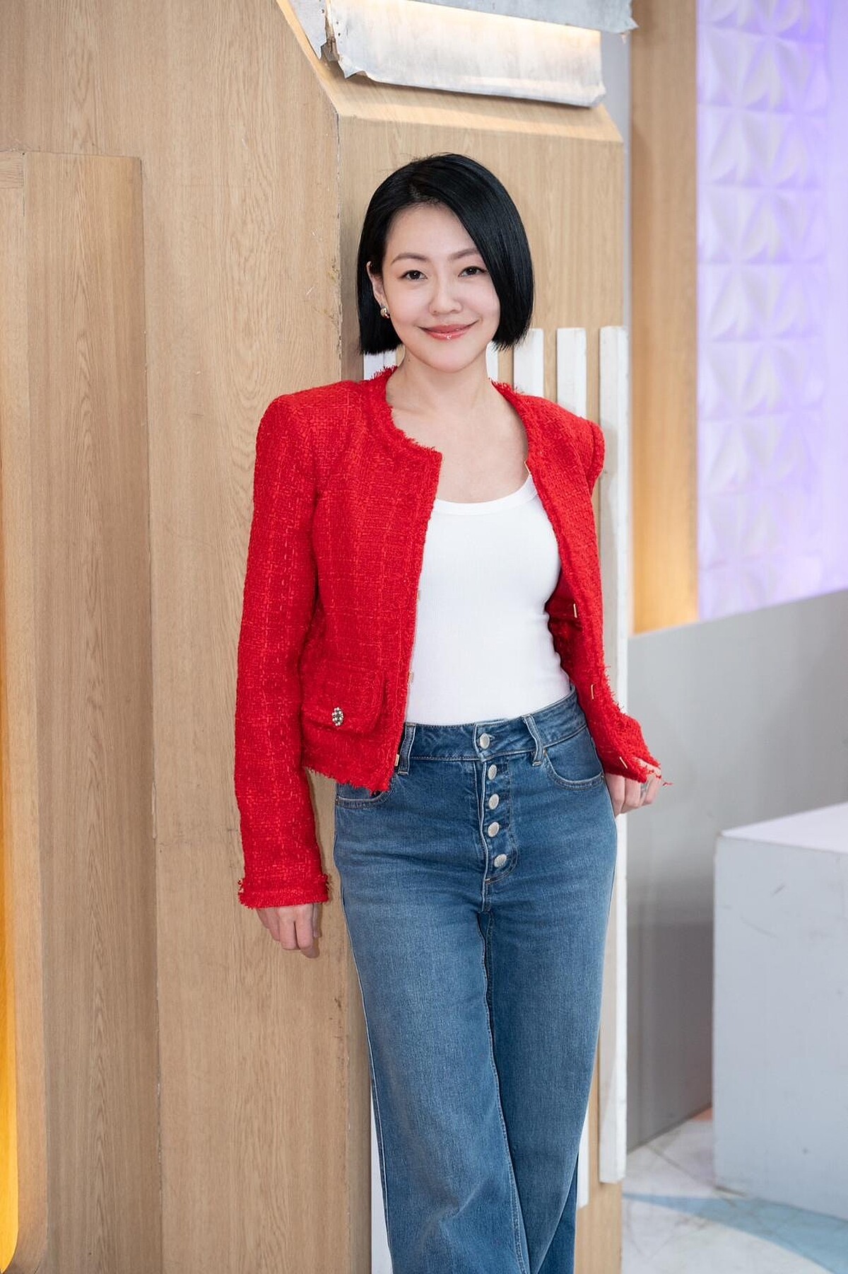 小S近日在節目中也選用alice + olivia 寶石紅系列的 Landon Tweed 紅色粗花呢外套,搭配 MISSA 復古高腰丹寧褲,營造修身好比例,優雅又率性,無論是新年走春或是參加派對都適合。