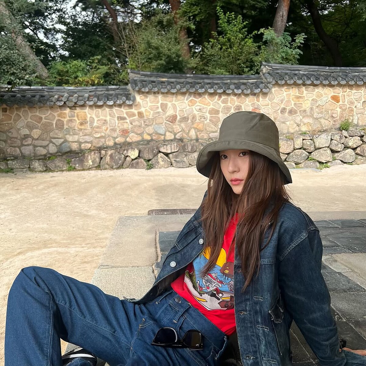 牛仔是永不過時的流行元素,成套的套裝更能夠展現俐落的時尚風格,比起簡單的白T,Krystal選擇帶有復古圖案的美式T恤畫龍點睛,活潑又不失個性,再利用墨鏡和慵懶的漁夫帽展現鬆弛感,跑咖或是逛景點拍照都很適合。