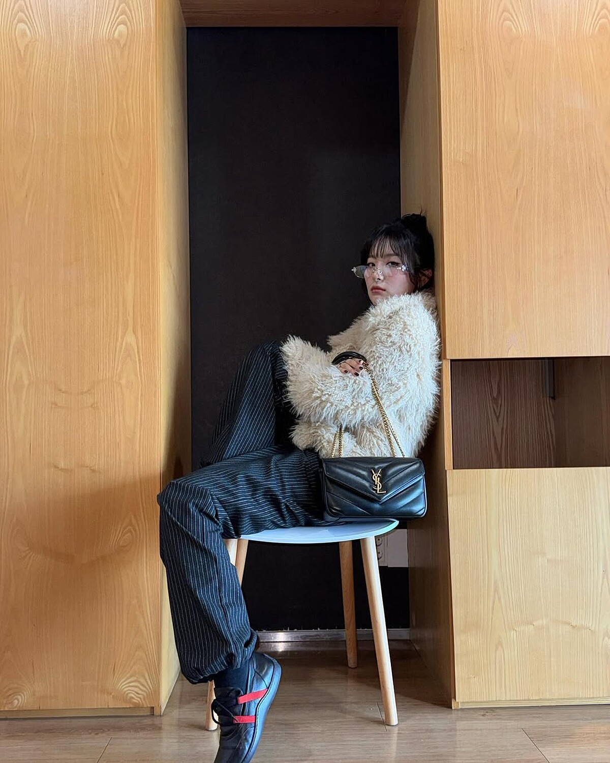 不知道大家有沒有注意到,近期姊姊型的女生越來越受到歡迎,而Red Velvet成員澀琪自帶高級清冷感的長相,讓她可以駕馭各種浮誇的造型。如今年一定要收一件的毛毛外套正是展現休閒奢華感的最佳單品,下身搭配深色的縮口褲和球鞋,既方便舒適又不會太過隨便,最後也別忘了展現高智感的細框眼鏡,馬上讓妳回頭率激增。