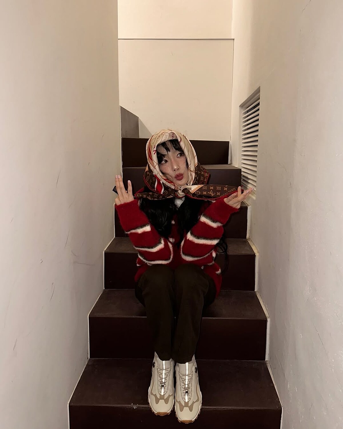 泰妍這套紅色系穿搭相當應景,過年想要穿點增加喜氣的配色不妨參考她的搭配方式,今年人手一件的條紋針織外套穿上氛圍感十足,下身以合身的直筒褲配上球鞋,整體造型乾淨俐落,若希望造型感再強烈一些那就來點復古的絲巾點綴吧,不論是當作頭巾或是領巾穿上,上鏡都存在感十足。