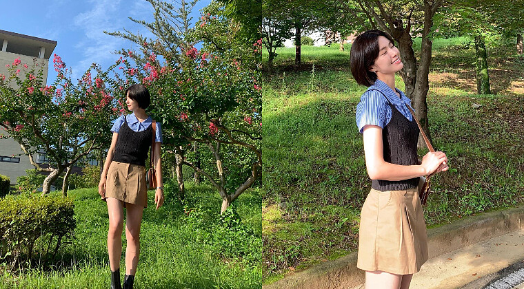 韓國四季分明,許多人喜歡利用「疊穿」的方式增添穿搭的層次感以及變化。藍色的條紋襯衫自帶知性的氛圍,且基礎又百搭,配上合身的黑色針織背心展現些許成熟的氛圍,最後以卡其色的迷你裙打造濃濃的學院感,適合各種年齡層的女生,也很顯年輕。