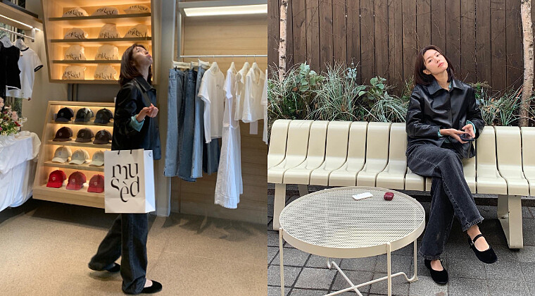 不論是通勤穿搭或是日常逛街,一件皮質夾克都能替妳增添氣勢。夏英以率性的翻領皮革外套搭配同色系的黑色牛仔褲,整體雖然都是黑色,但利用材質的變化營造豐富效果,鞋子則是捨棄正式的跟鞋,換上輕巧可愛的芭蕾舞鞋更顯得甜美愜意,結合率性和溫柔的穿搭怎能不愛呢?