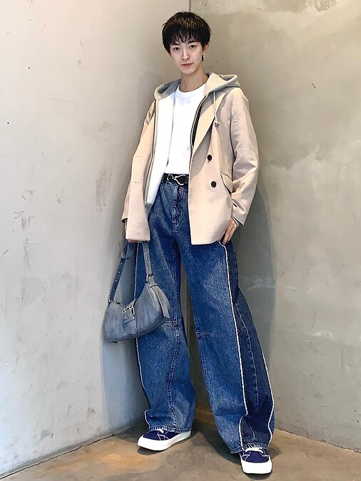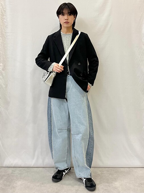 西裝造型搭配淺色牛仔寬褲,上窄下寬的比例營造好身形,此種穿搭方式更符合時下趨勢,鞋款選擇一雙平底球鞋,俐落有型且耐看!