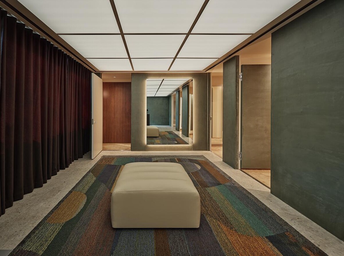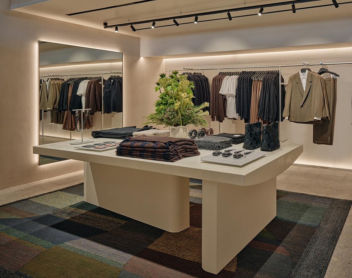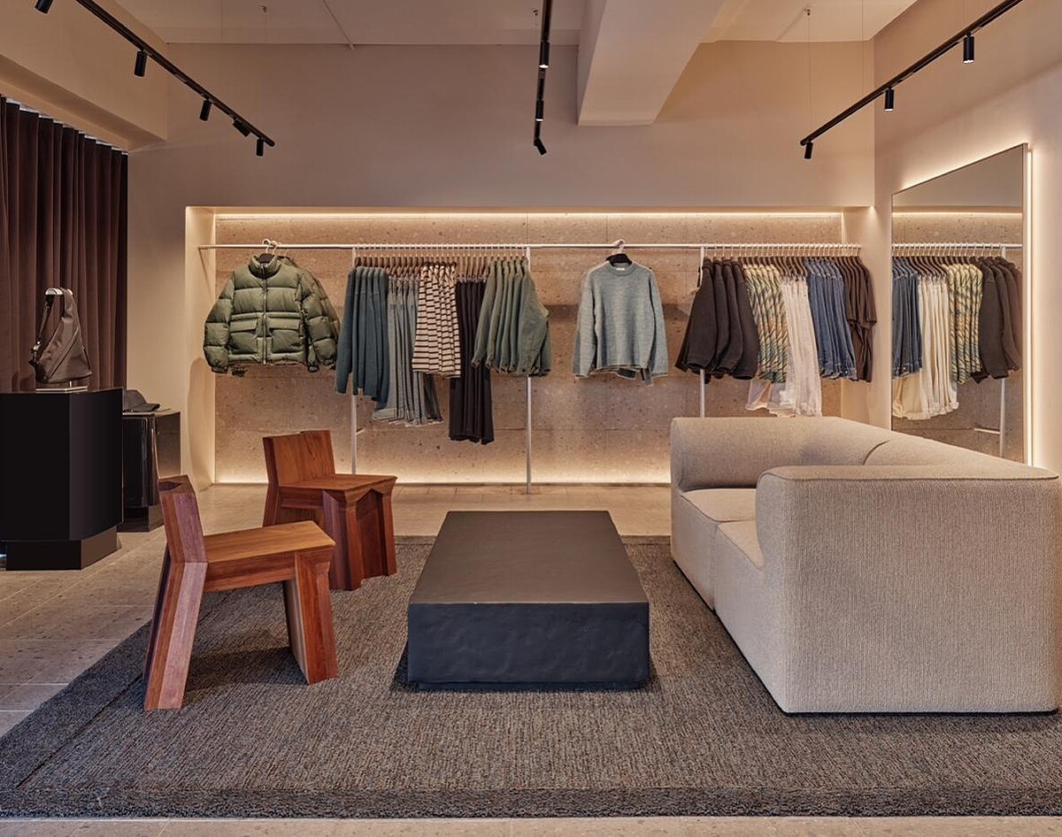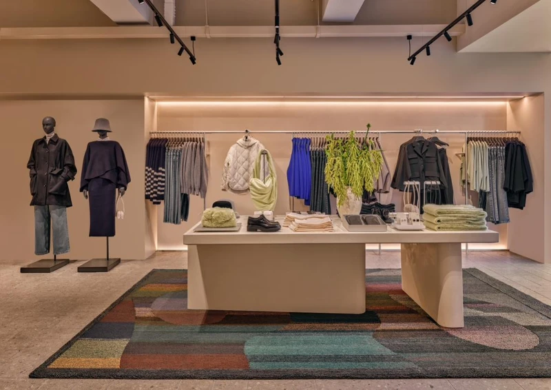 COS在全球的展店計畫中持續跟隨品牌的永續願景,他們並沒有用力去誇大所有的永續材質用在哪裡?而是默默的一直做下去。COS清潭旗艦店裡,同樣使用眾多回收材料來打造店裝,從邊角料織成的地毯、紙漿製的桌面、磁磚、衣架……通通做到最大程度的環保,同時保持簡約質感的逛街空間。家具部分則是採用首爾和倫敦設計師 Subin Seol 作品,各式椅子都是獨特創新的設計。