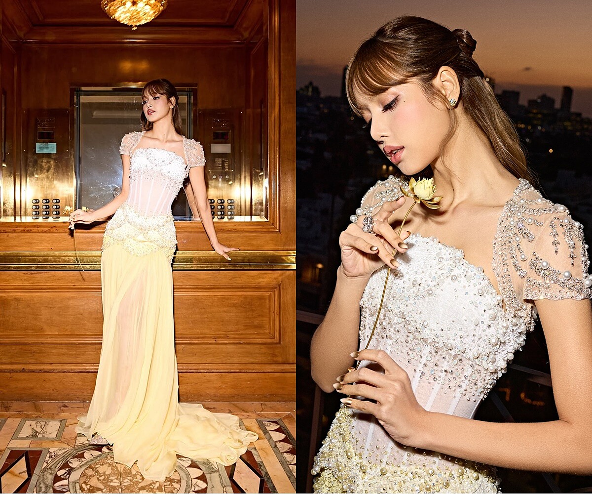 《白蓮花大飯店3》洛杉磯首映活動時立刻掀起話題,Lisa的黃色雙色禮服來自韓國品牌Miss Sohee,正好呼應蓮花的顏色,上身馬甲板型、錯落的珍珠水鑽⋯⋯處處都是細節;她手持的一朵金蓮花,則同樣是由Sarran替這部影集和Lisa專門打造,命名為「蓮花之光」。
