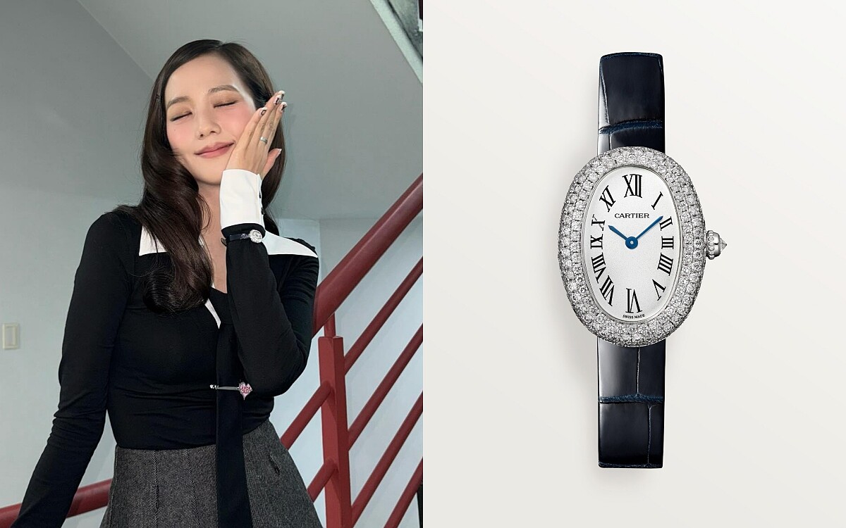 精緻的腕錶是許多韓國女生喜愛用來凸顯品味的關鍵單品,衣服款式可以很簡單,但質感配件不能少!來自Cartier的Baignoire腕錶以海軍藍色的鱷魚皮革錶帶搭配750/1000白K金錶殼和圓珠形錶冠,一共鑲嵌228顆的圓形明亮式切割鑽石,疊搭在針織上衣外盡顯奢華。