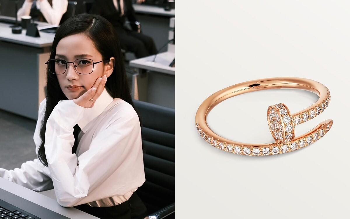 戒指除了裝飾造型的功能,據說也有帶來好運的象徵。Jisoo在MV中的辦公室造型多以簡約卻充滿特色的珠寶配件點綴,這款來自Cartier的Juste un Clou戒指以流暢的外觀搭配明亮式切割鑽石,在滿足時尚感的同時又不會影響辦公做事,是上班族也能納入收藏清單的款式。