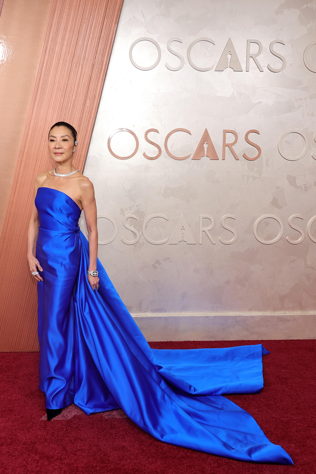 楊紫瓊的選色也相當出跳,她身穿Balenciaga 第52季高訂系列的寶藍色禮服,帶來貴氣高雅的氛圍,顯現了她在電影圈中的地位。