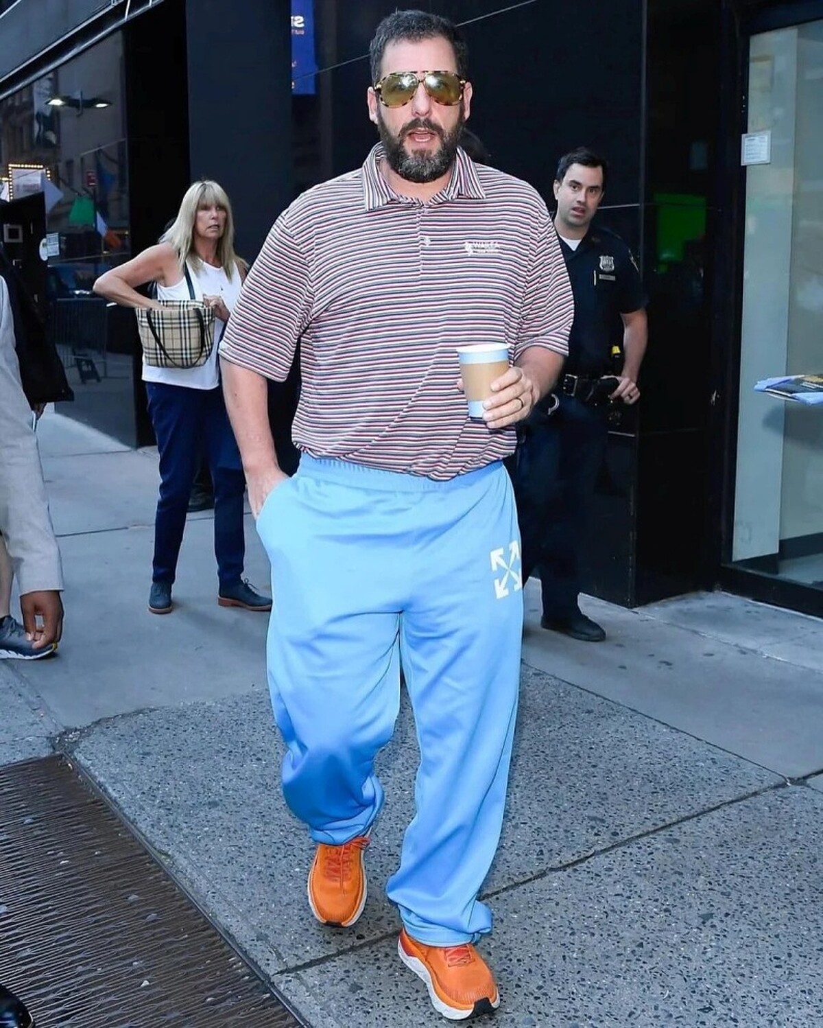 亞當山德勒曾經在採訪中分享自己的穿搭哲學:「不要拘泥於特定的標籤,只要穿讓自己舒服的衣服就好」。在亞當山德勒身上有一套常見的穿搭公式,那便是簡單的T-shirt、Polo衫或是花襯衫,配上運動褲以及球鞋,是他日常最常穿的服裝組合(不確定有沒有其他組合)!多年來他的穿搭風格幾乎不曾改變,久而久之,這已成為了一種「Sandlercore」,現在看來,他不經意的色彩搭配、偏好鬆垮的剪裁、亮眼的機能籃球鞋…竟意外有一種獨特的潮流感,但或許也只有亞當山德勒駕馭的來。像是這一套條紋polo衫配上寬鬆剪裁Off-White 經典logo淺藍運動長褲,展現街頭潮流元素,延續一貫愛穿運動鞋的風格,他運用橘色球鞋大膽玩色,超大 Aviator 飛行員墨鏡,更為整體造型增添低調明星氣場。